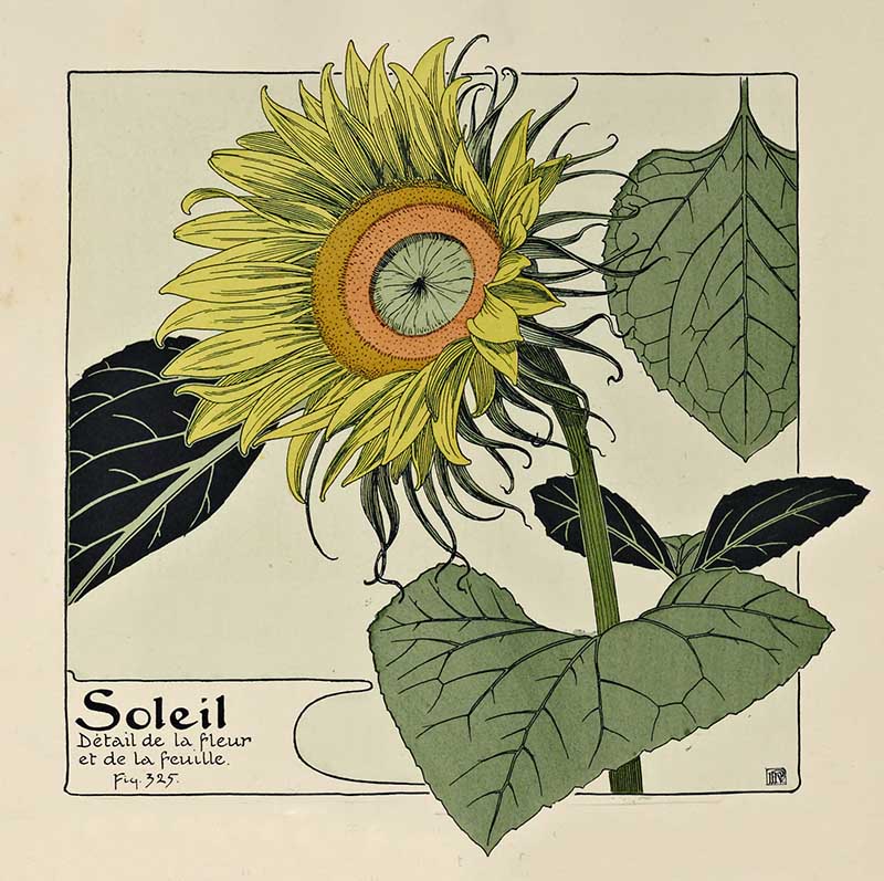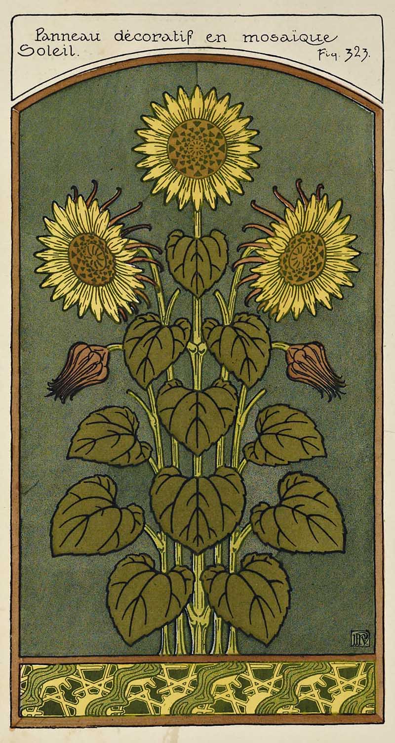 Sunflowers are popular in Art Nouveau because their bold, radiant shapes perfectly embody the movement’s focus on natural beauty and organic forms. Their vibrant, sun-like appearance adds a touch of nature’s elegance and energy to the art. Plus, sunflowers’ flowing lines and intricate details align seamlessly with Art Nouveau’s signature style, making them a favourite subject for artists who blend the natural world with decorative art.