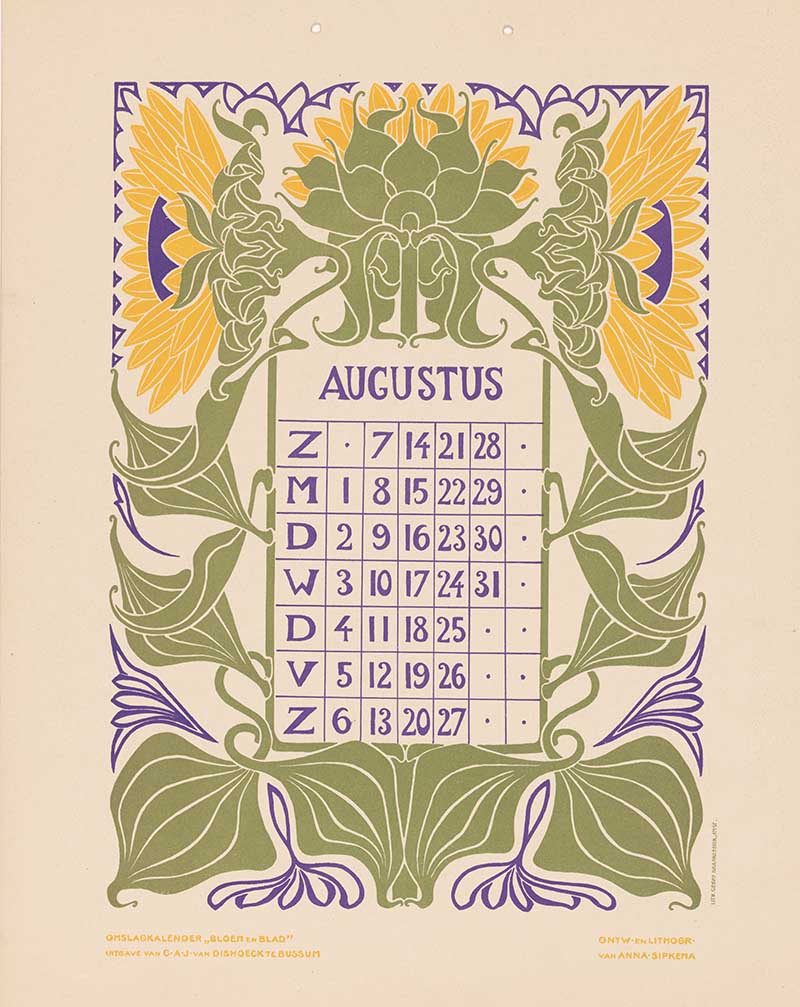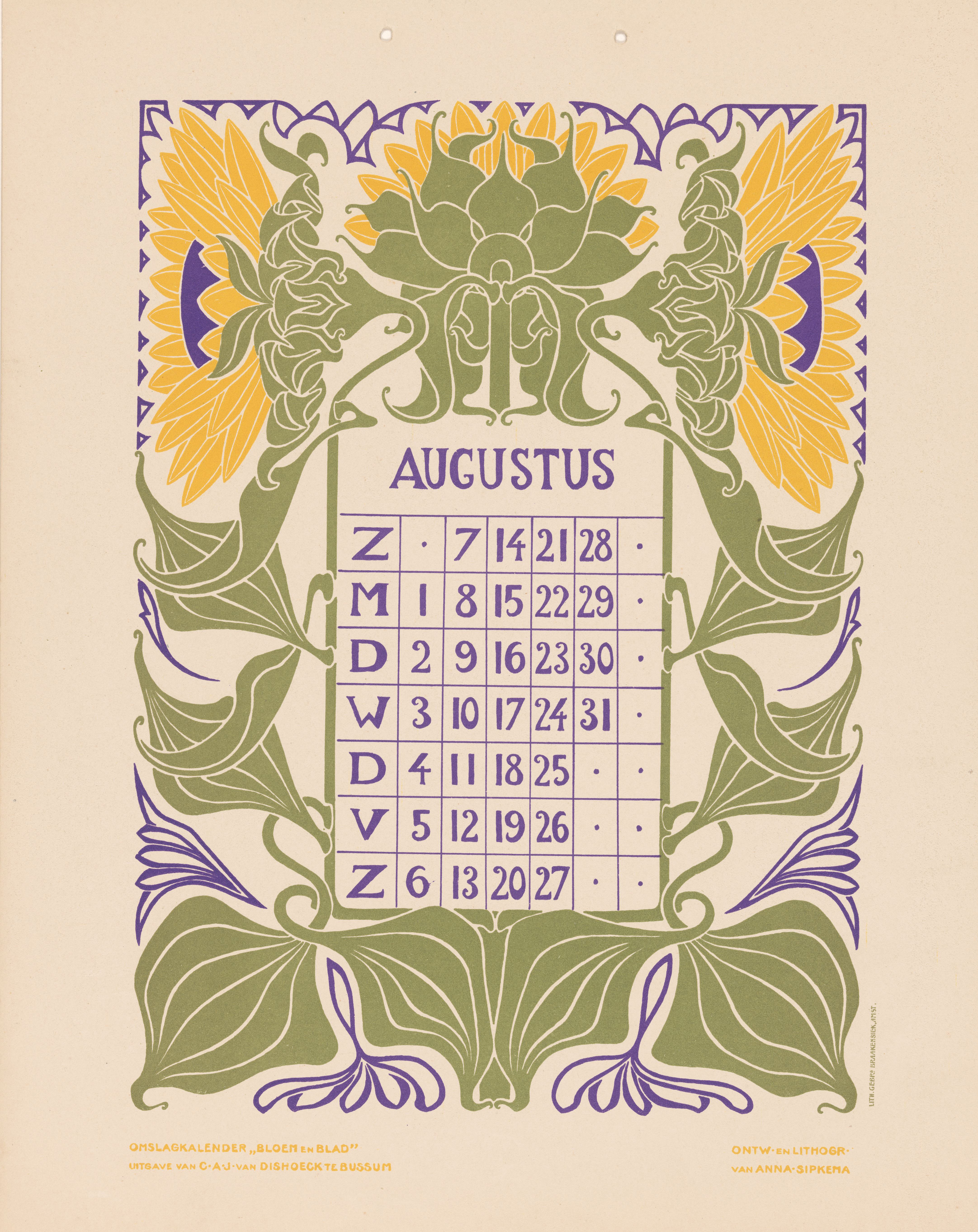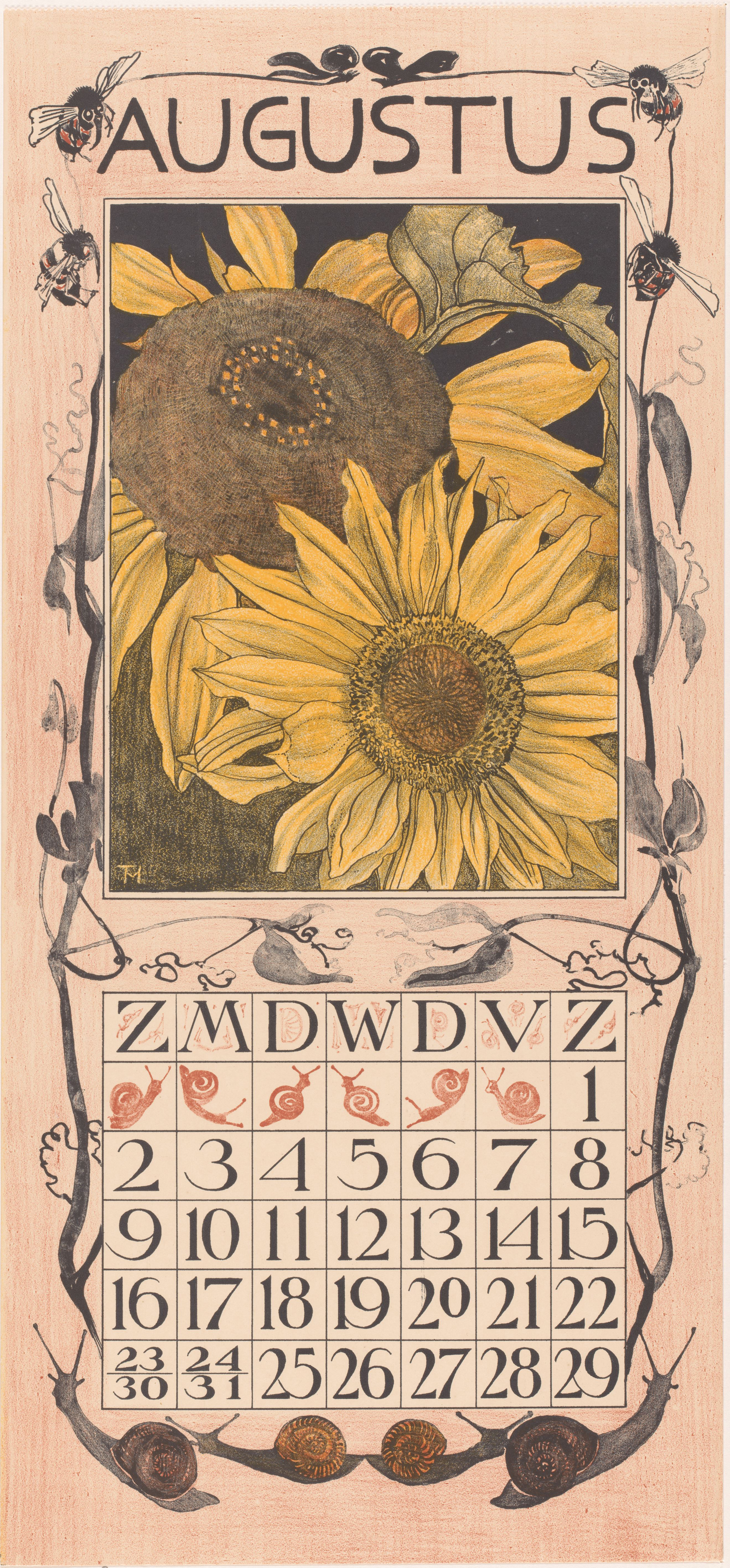 Another August Art Nouveau calendar page featuring sunflowers. This is by Theo van Hoytema, 1903.