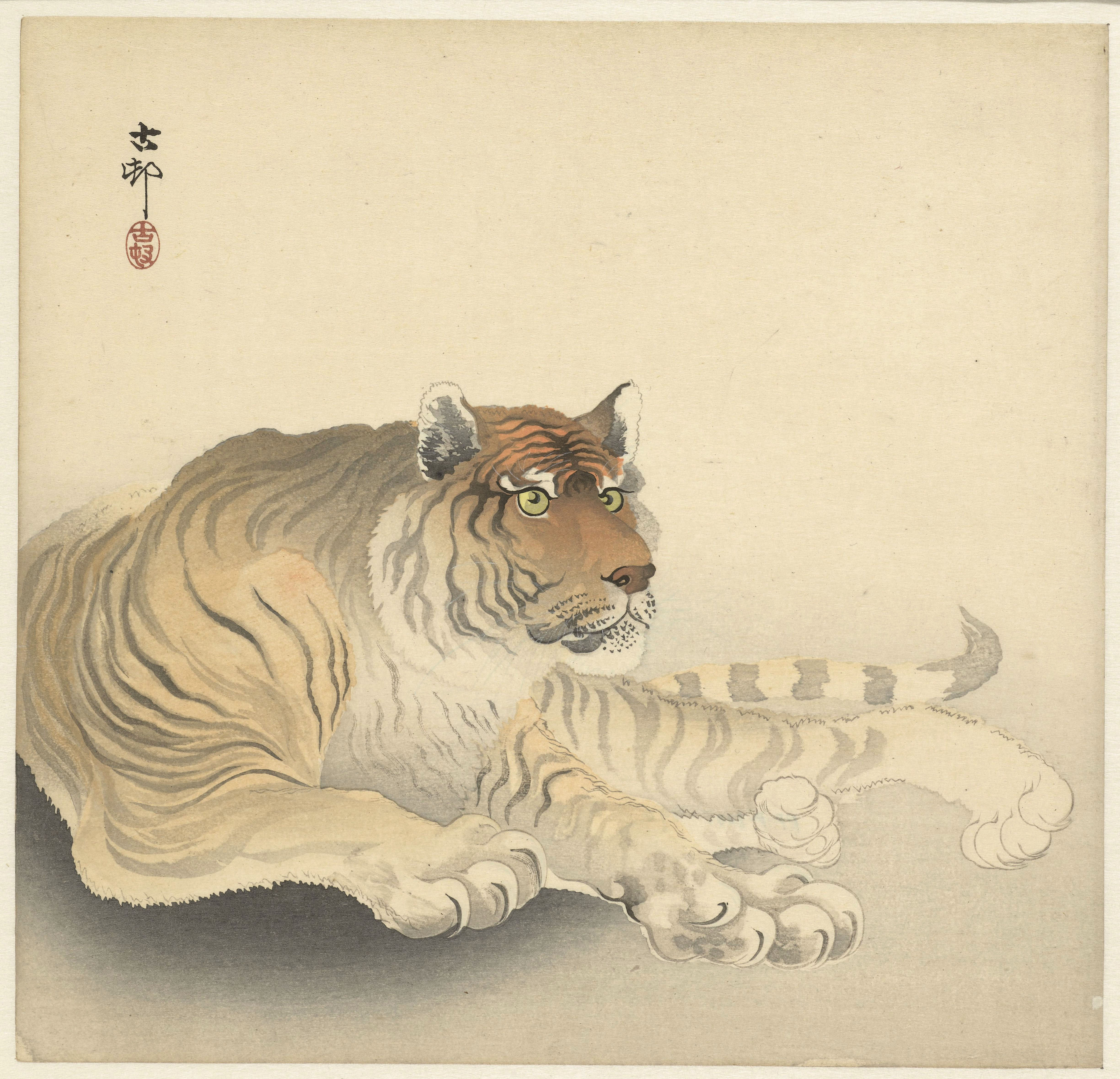 A resting tiger painted by the Japanese artist Ohara Koson.