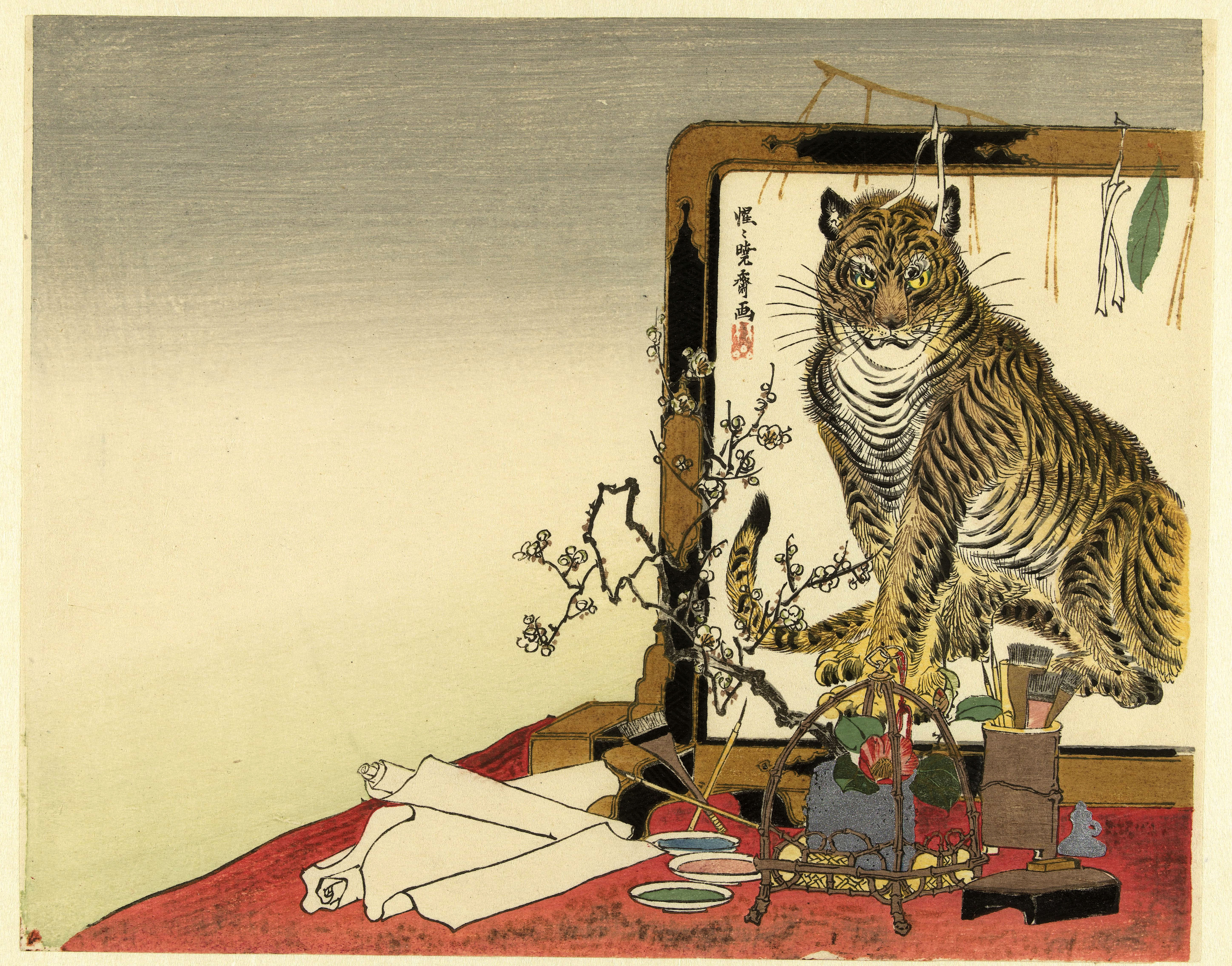 In this print, most likely designed to celebrate the arrival of the Year of the Tiger in 1878, Kyōsai depicts an artist’s studio with all the accoutrements of an accomplished painter, including ink, brushes, and rolls of paper. Kyōsai was celebrated for his depictions of animals. In this print, he showcases his skill with depicting a majestic tiger on a painted screen, an image within an image. He has cleverly rendered his signature as if it appears on the screen’s surface.