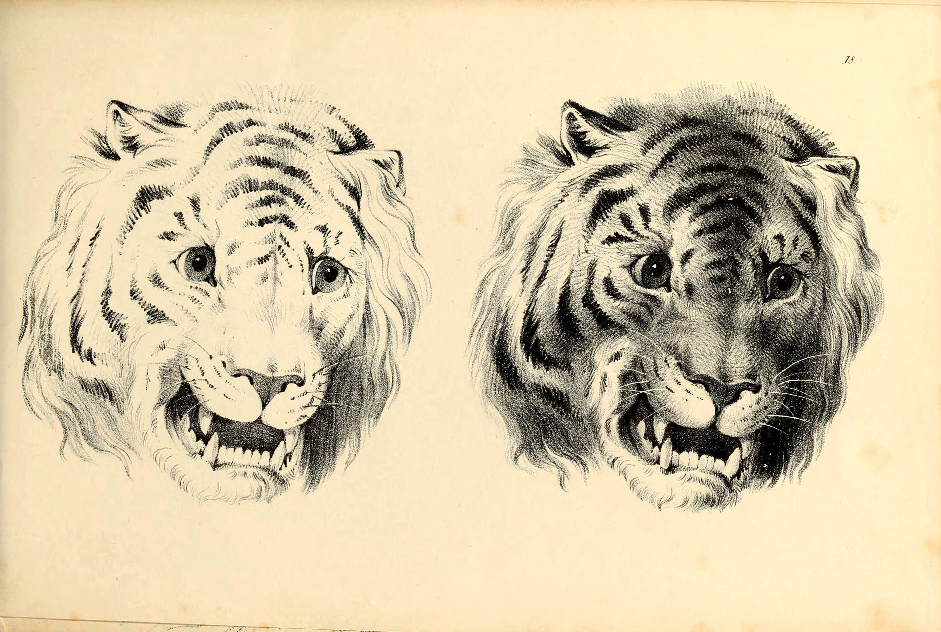 Two tiger face drawings from ” Fairland’s juvenile artist, or, Easy studies for beginners in drawing, of figures, animals, shipping, and landscape” 1838.