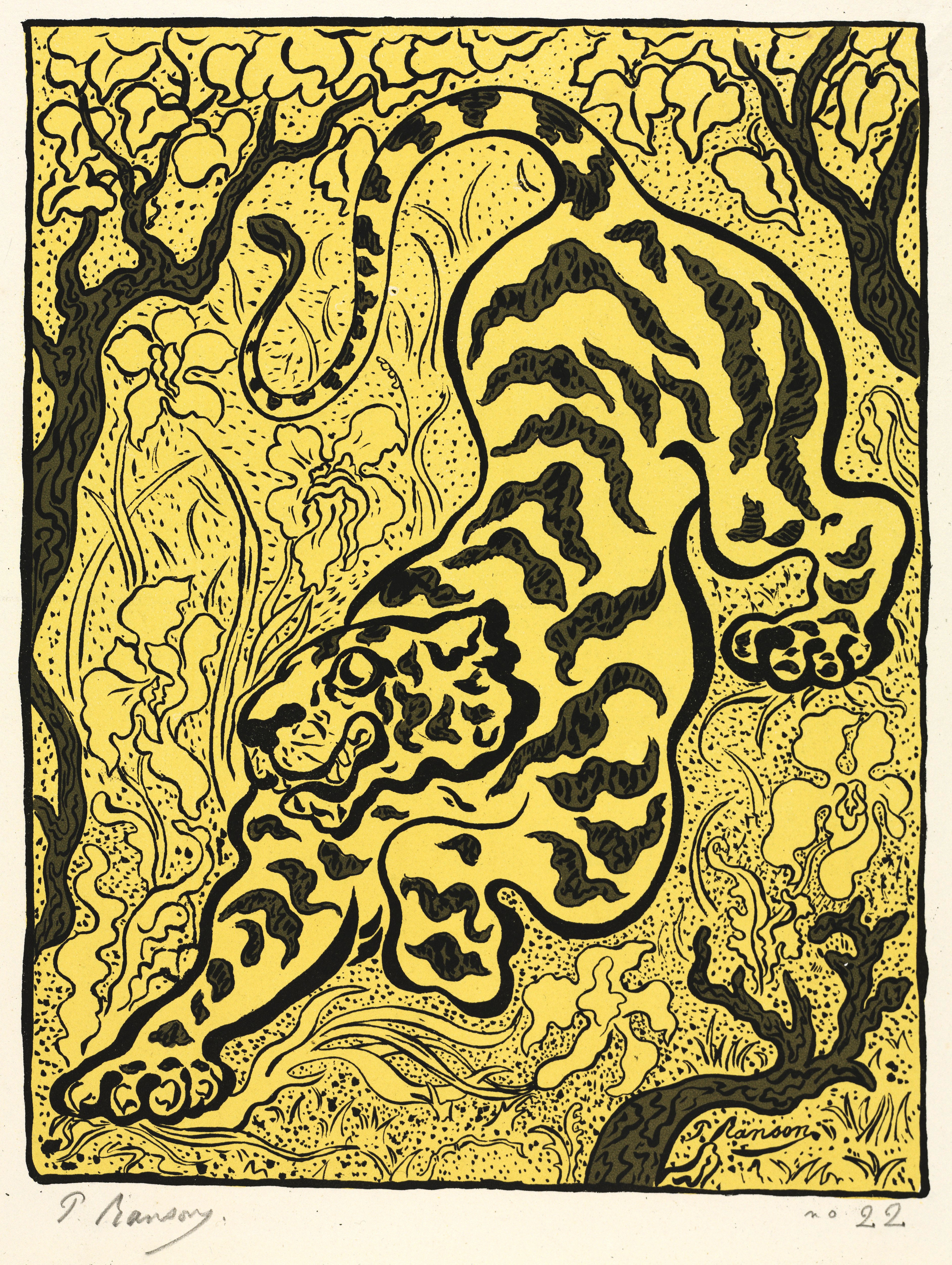 Tiger in the Jungle is Ranson’s most famous lithograph. Printed in black, grey, and yellow, it appeared in the journal L’Estampe Originale (The Original Print) in 1893. Ranson used smooth, wavelike forms to create a vibrant, decorative, and stylized composition.