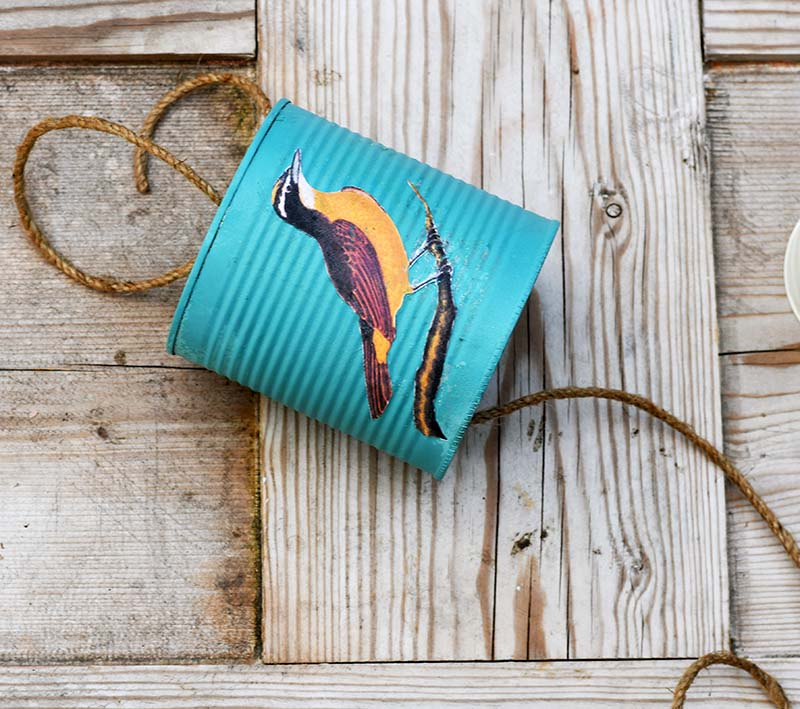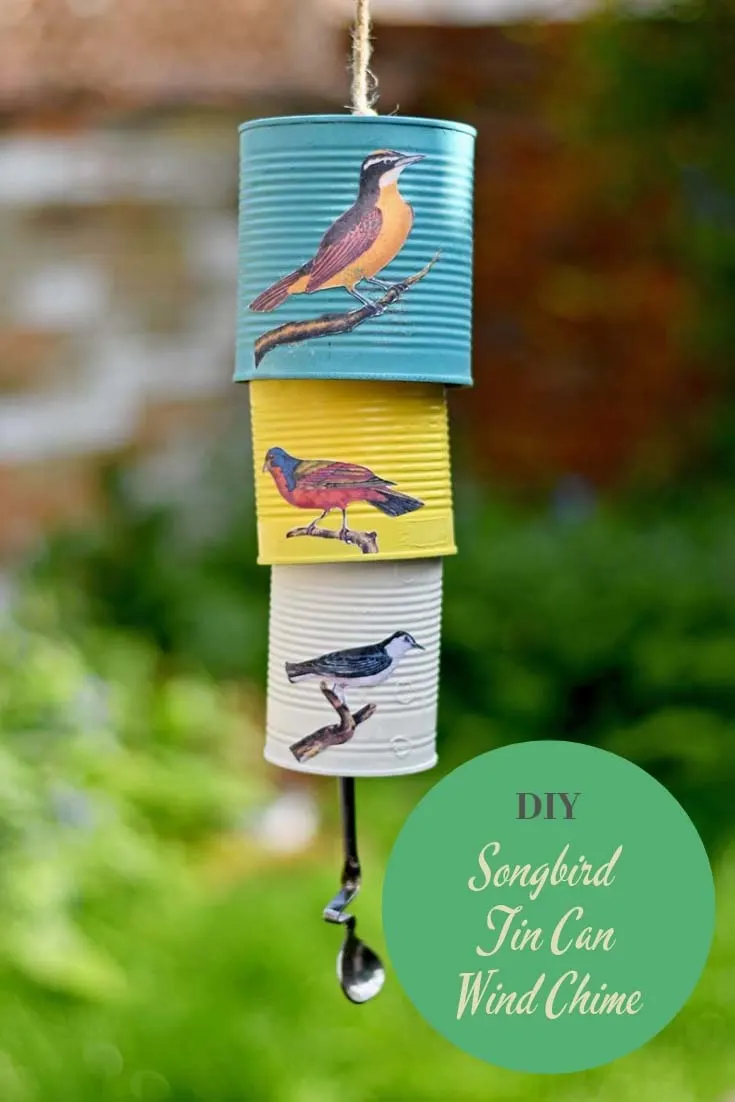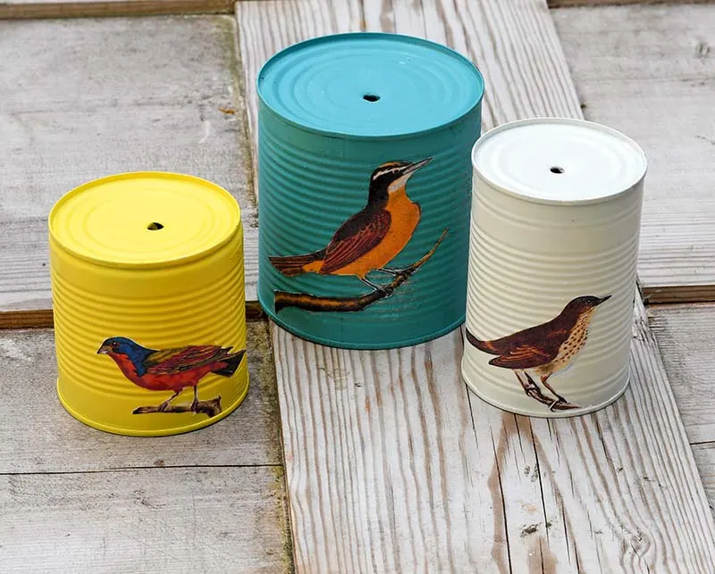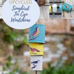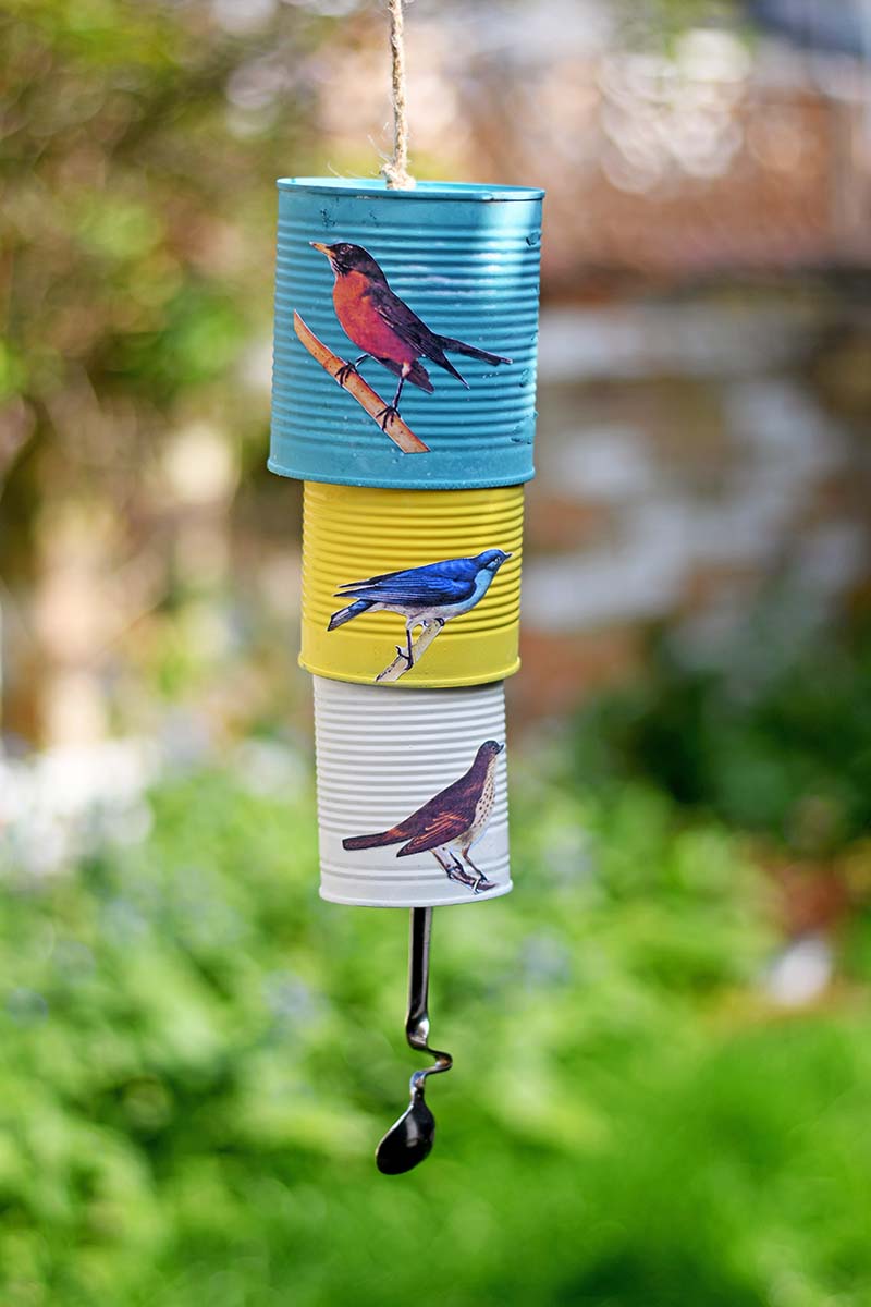 Last week I curated a beautiful collection of American Songbird prints. I thought it would be lovely to make something for the garden using these beautiful images. That’s when I came up with the idea for this pretty decoupage tin can wind chime.