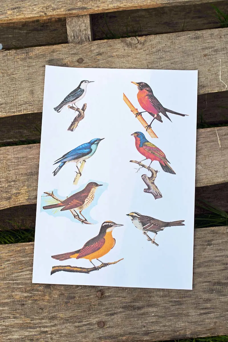 3. Print out the songbird images you are going to use for the decoupage. You may need to resize the images on your computer to make sure they are the right size for your tin cans. The ones on my sheet should fit most tin cans. Once printed carefully cut each bird out. I used my home printer for this.
