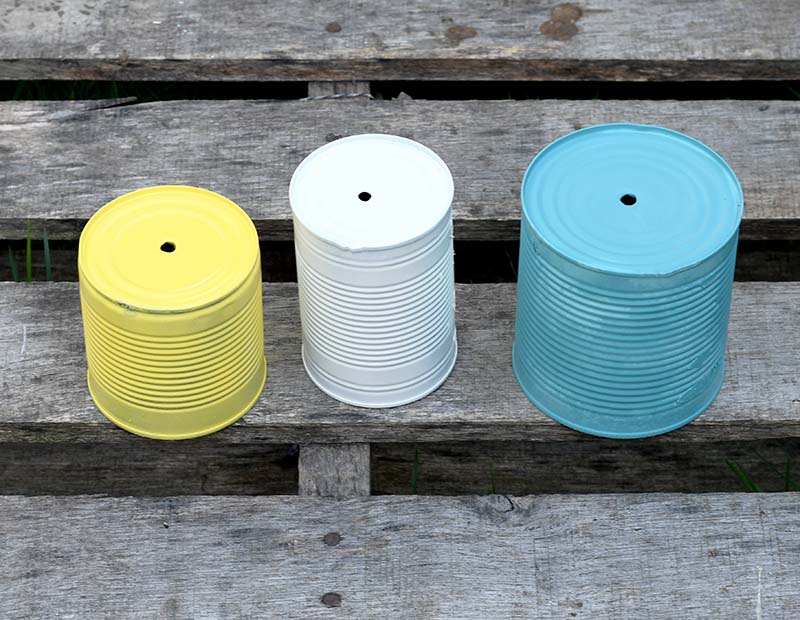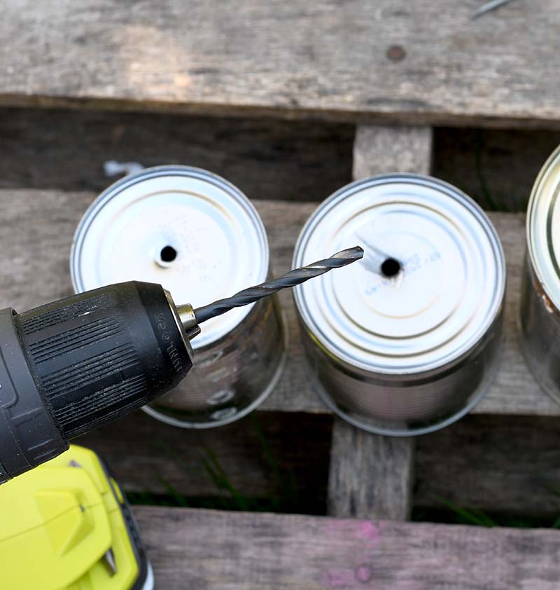 1. First, remove the labels from the tin cans. Then using an electric drill and a metal drill bit drill a hole into the base of each tin can. You need a hole just big enough to thread the twine through.