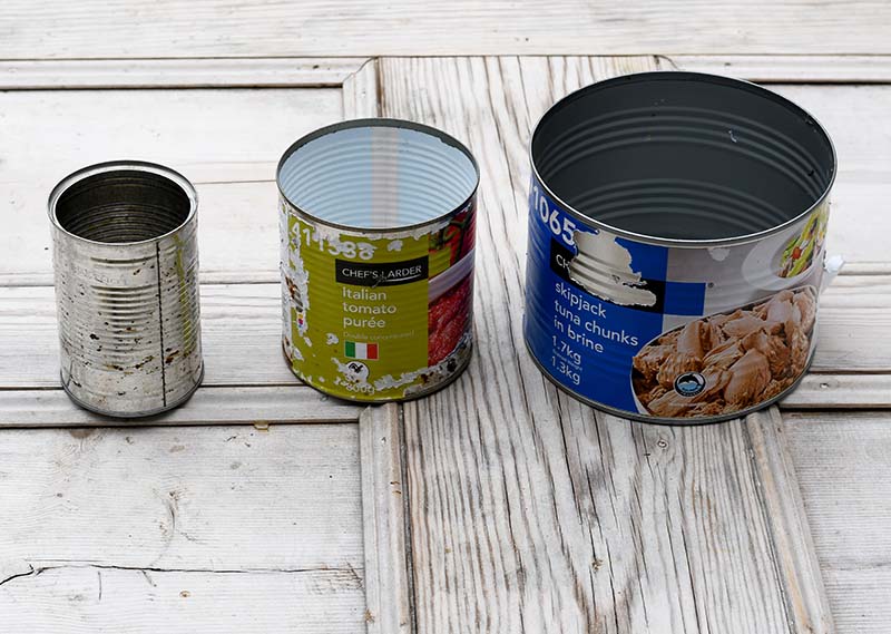 - Three tin cans in an assortment of sizes. Ideally, you want the tin cans to fit inside one another. You can use food cans or coffee tins for this.