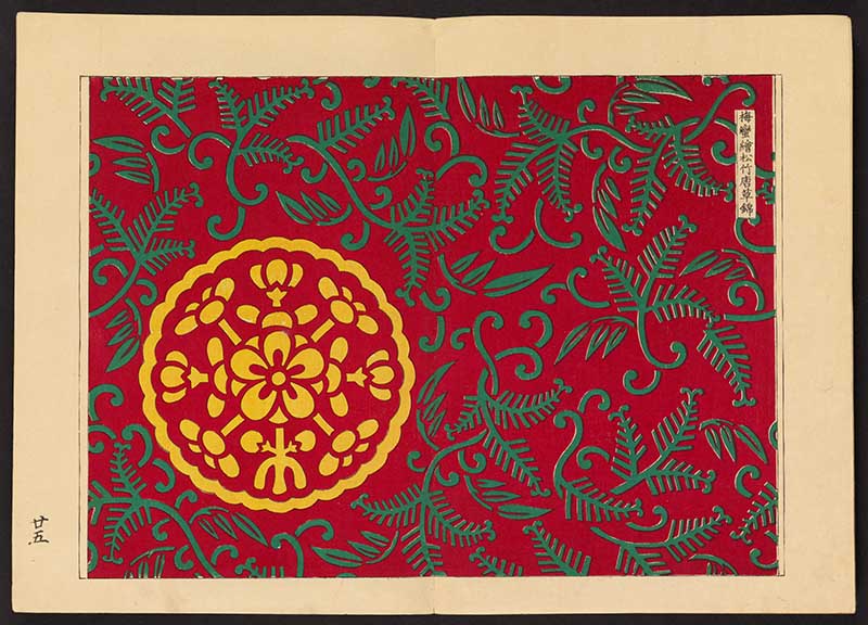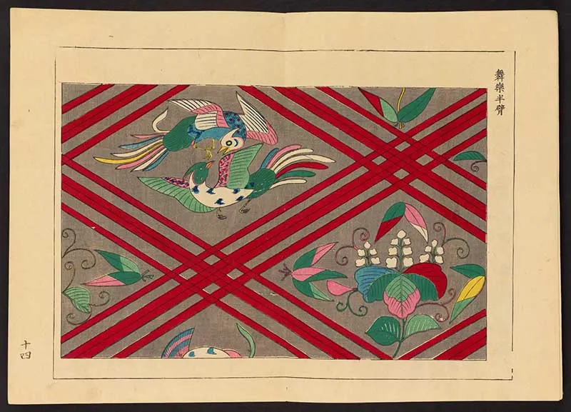 The small red pattern is an example of a “Kachō”, which means “flowers and birds”, and “ga”, which means “picture” or “painting.” Kachō-ga is a popular Japanese art and design motif featuring realistic and stylized depictions of various flowers and birds.