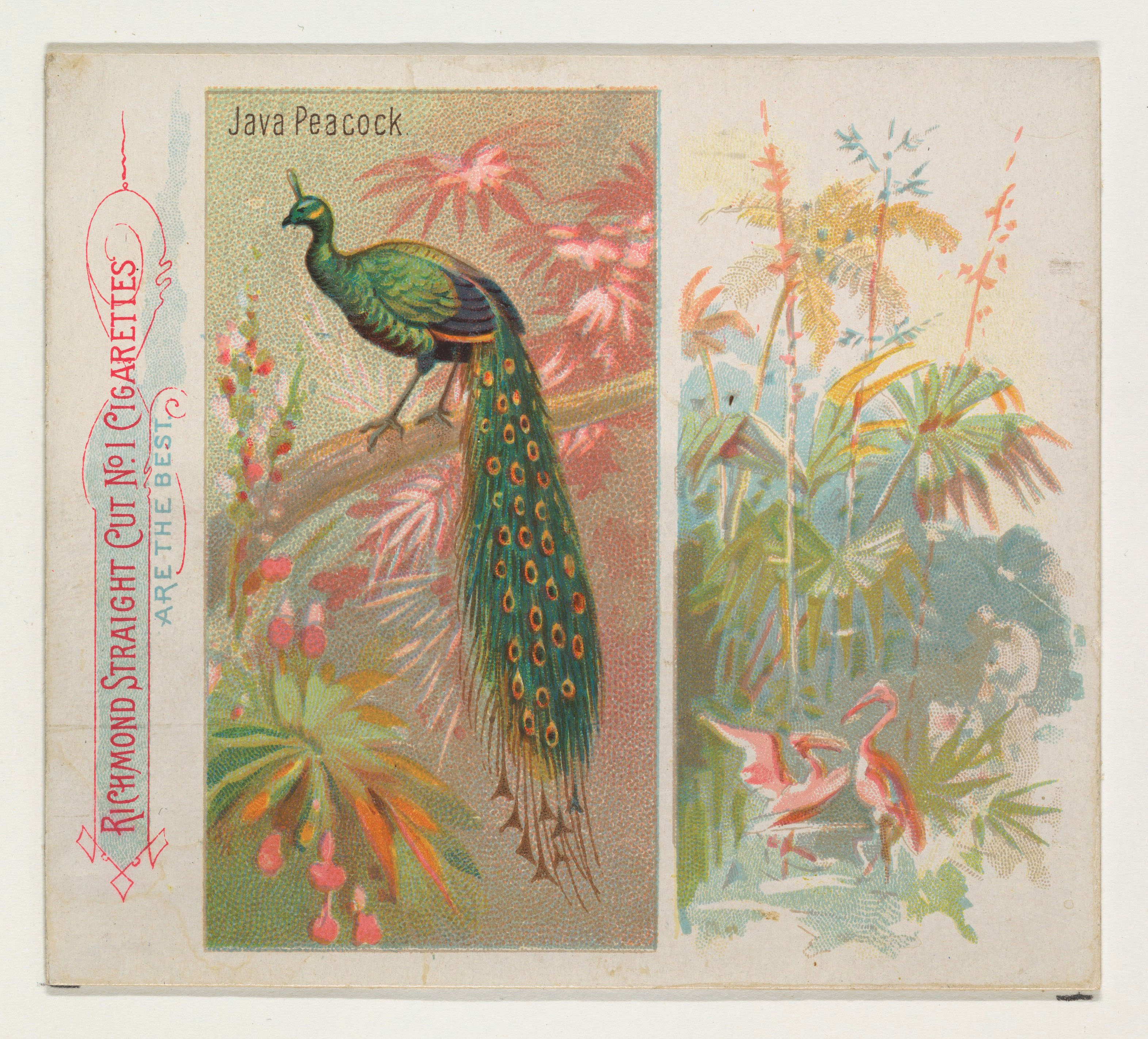 This is a cigarette card illustration of the tropical bird Java Peacock, better known as the green peafowl. It is an endangered bird from Southeast Asia.