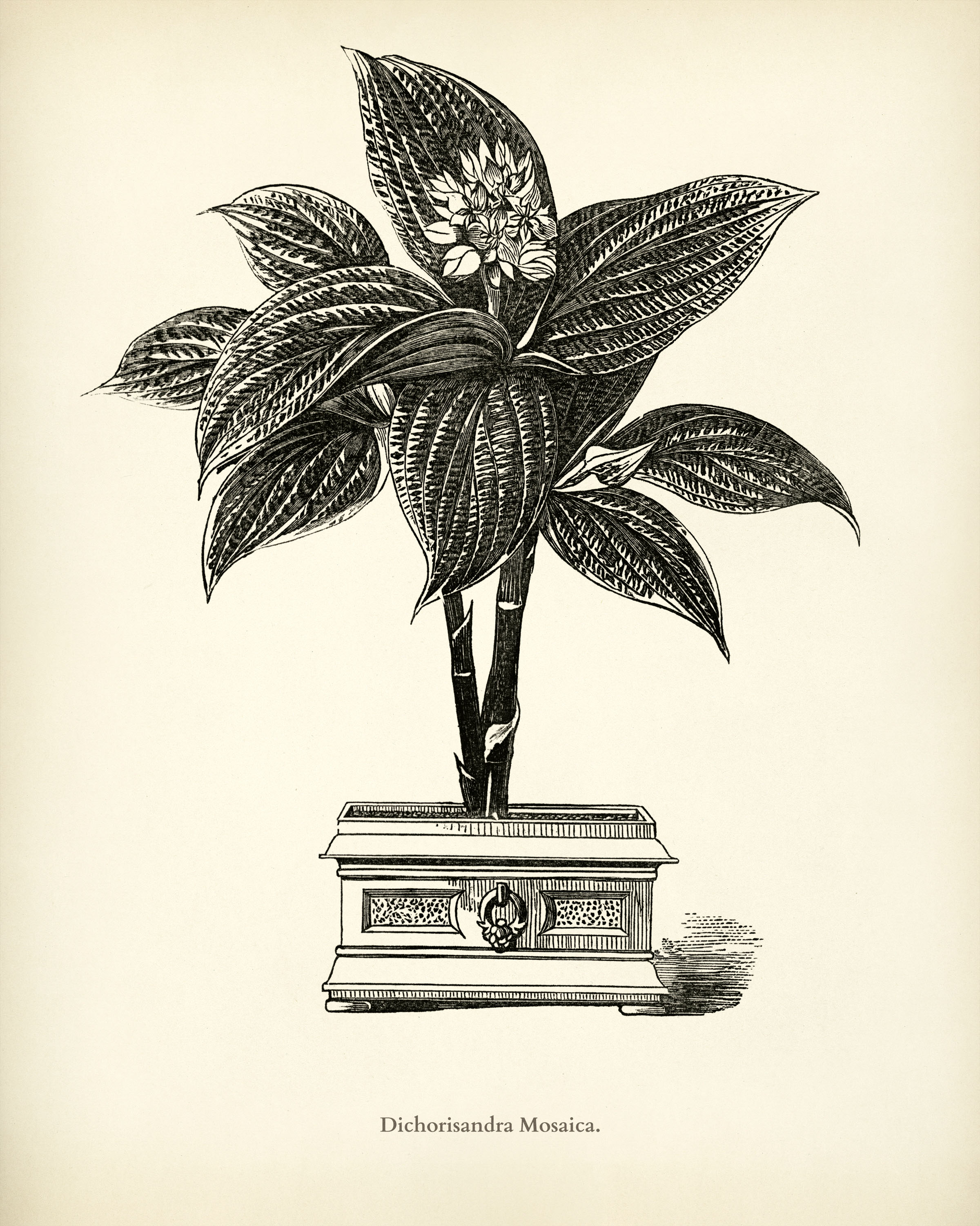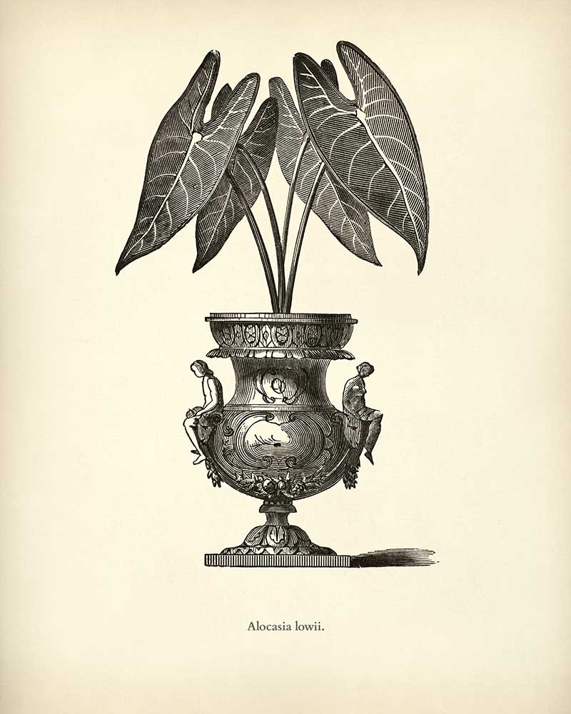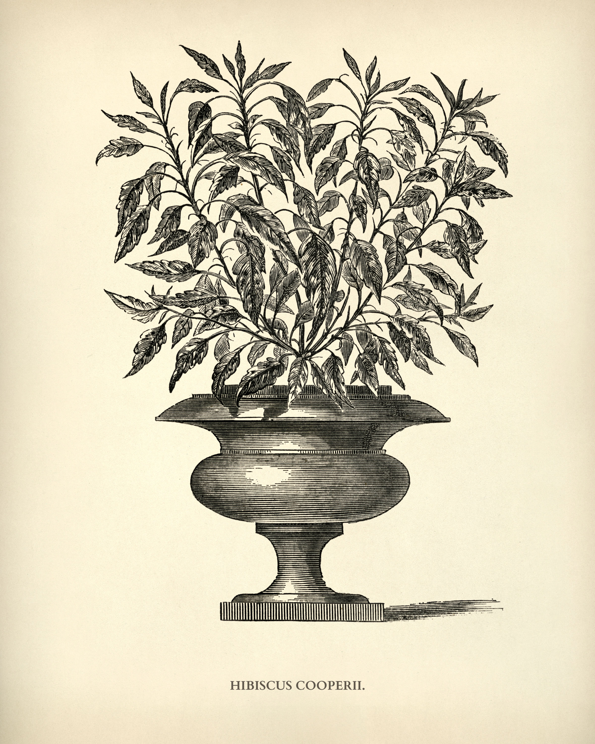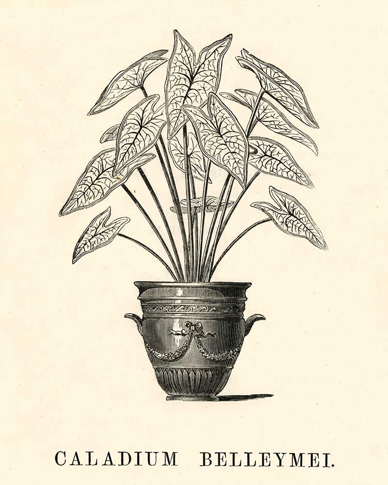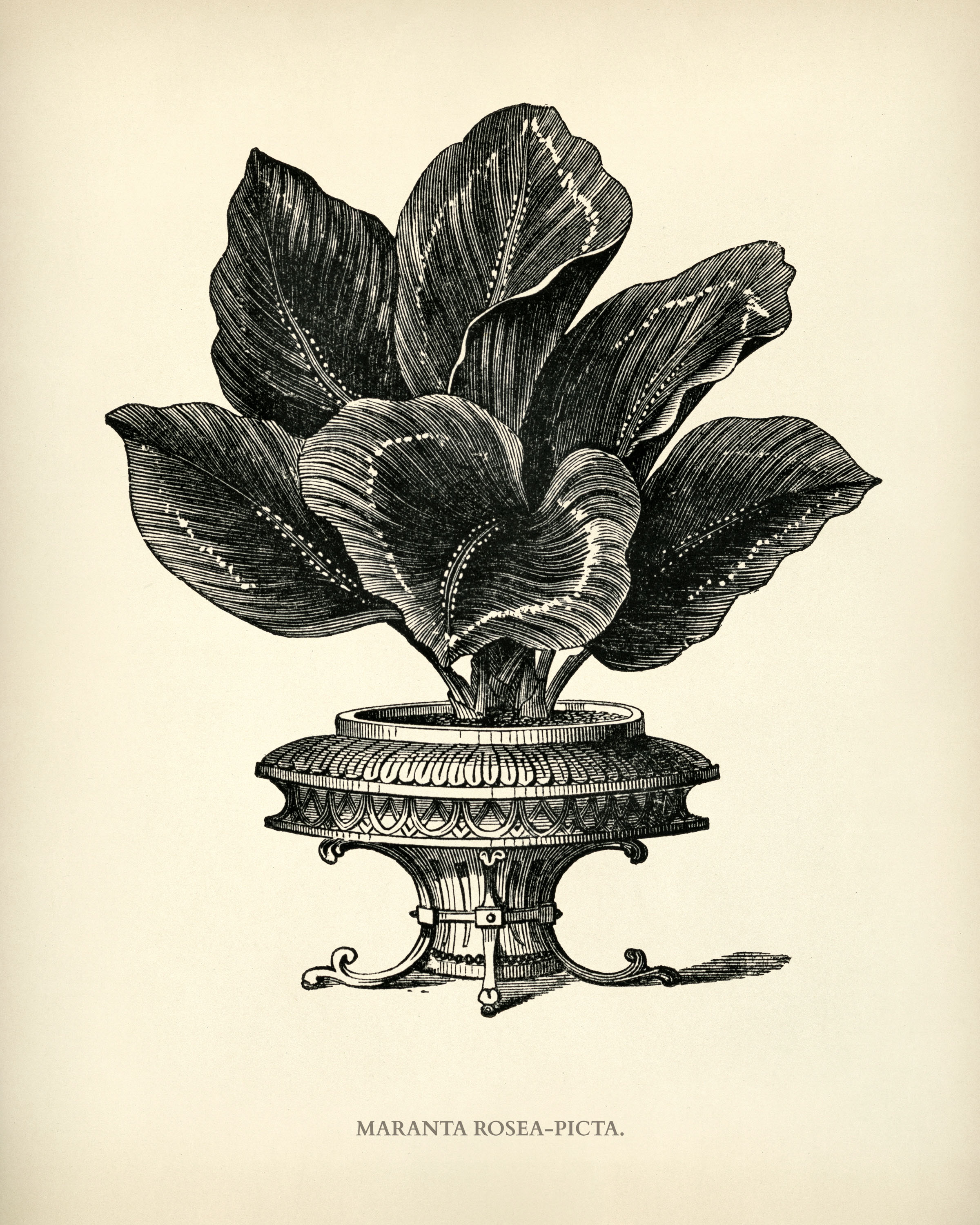 A collection of beautiful back and white prints of some of the tropical leaf plants in their original pots. Some of these victorian pots are just as beautiful as the plants in them.