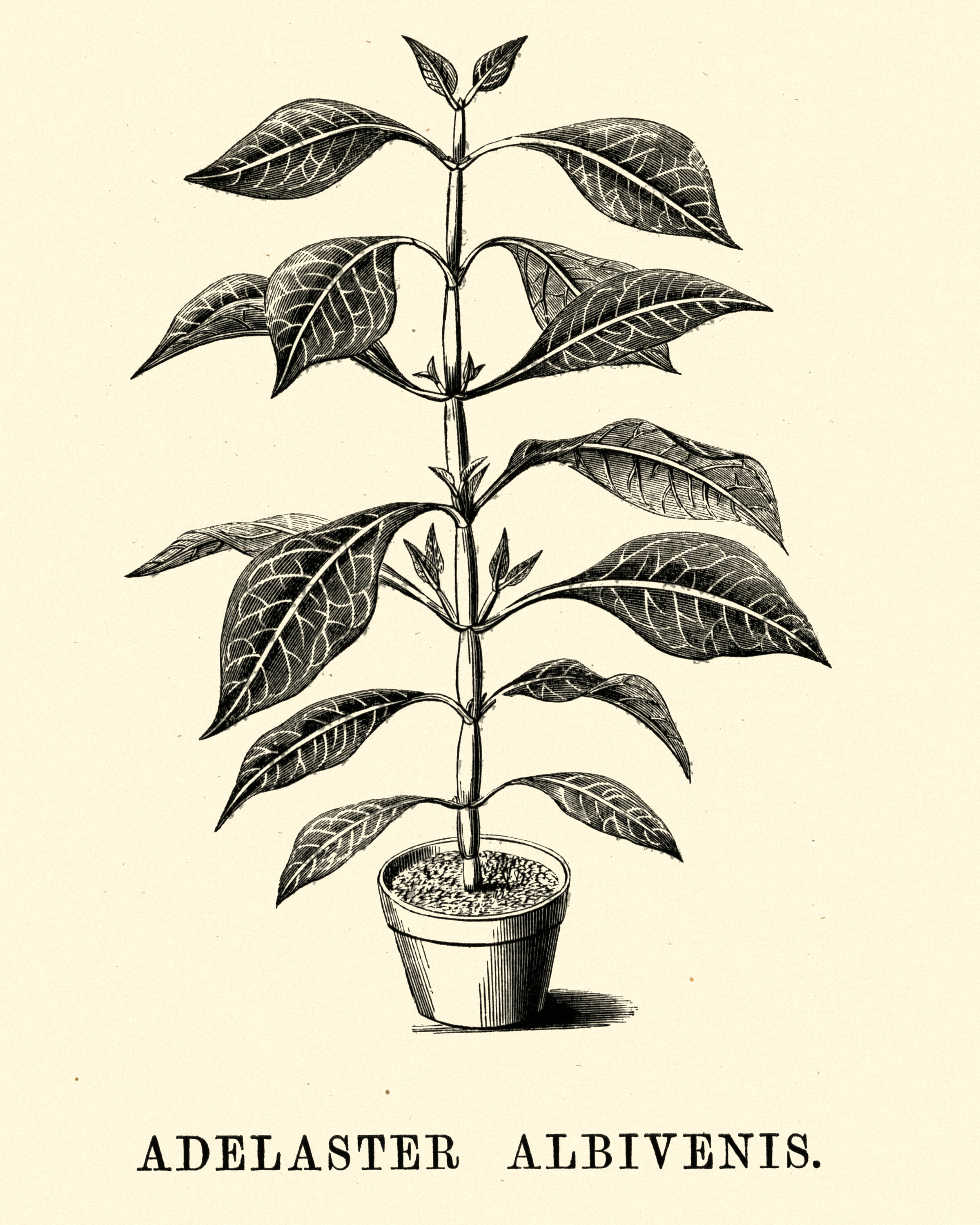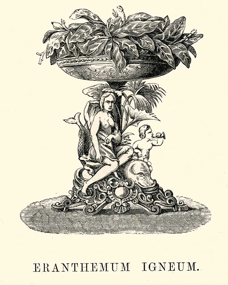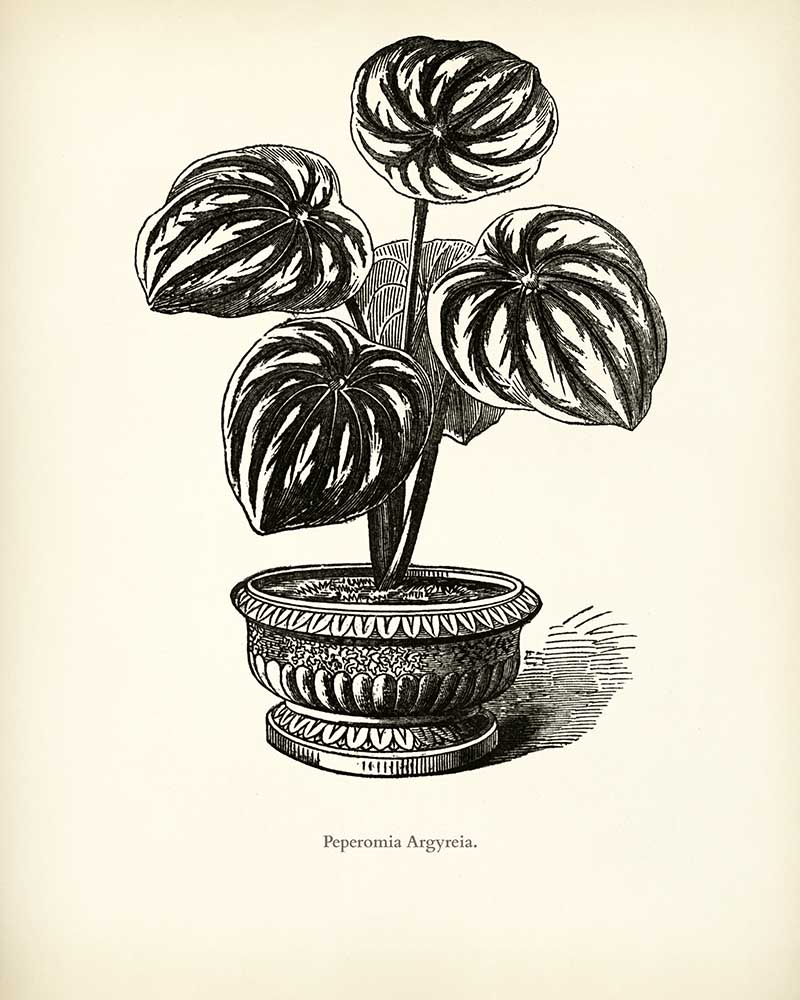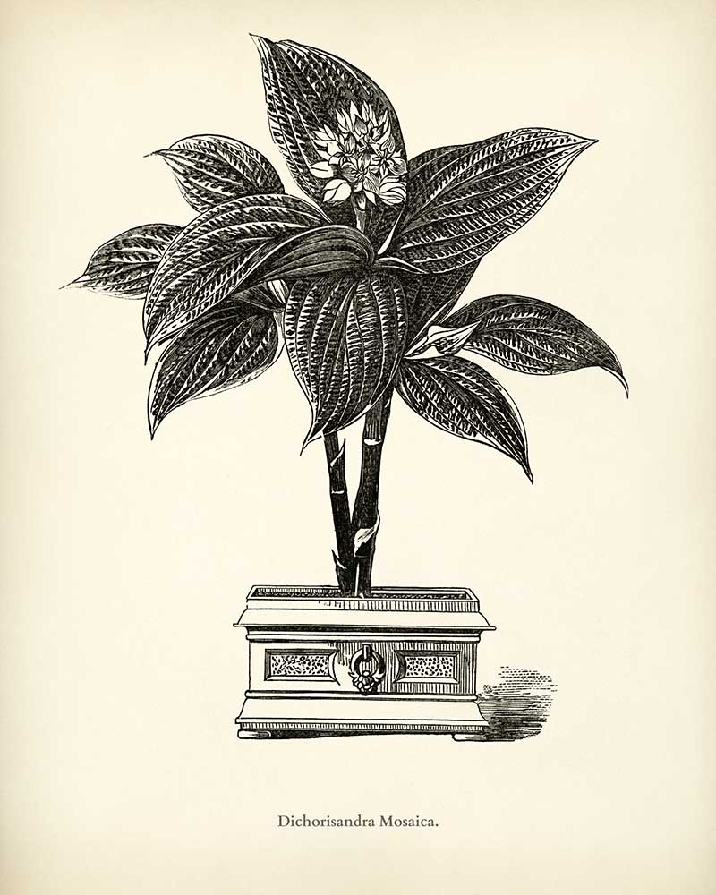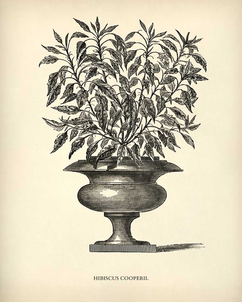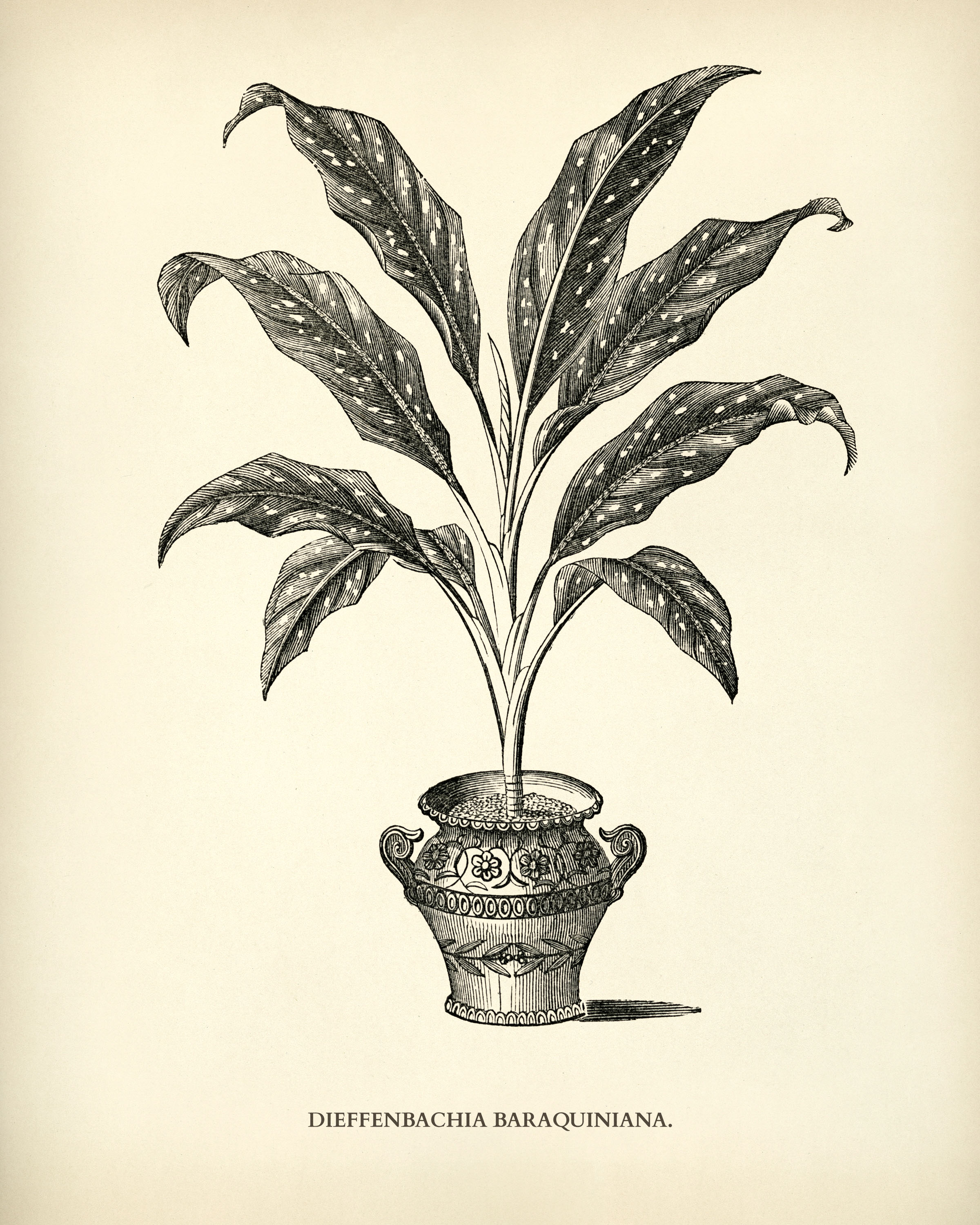 A collection of beautiful back and white prints of some of the tropical leaf plants in their original pots. Some of these victorian pots are just as beautiful as the plants in them.