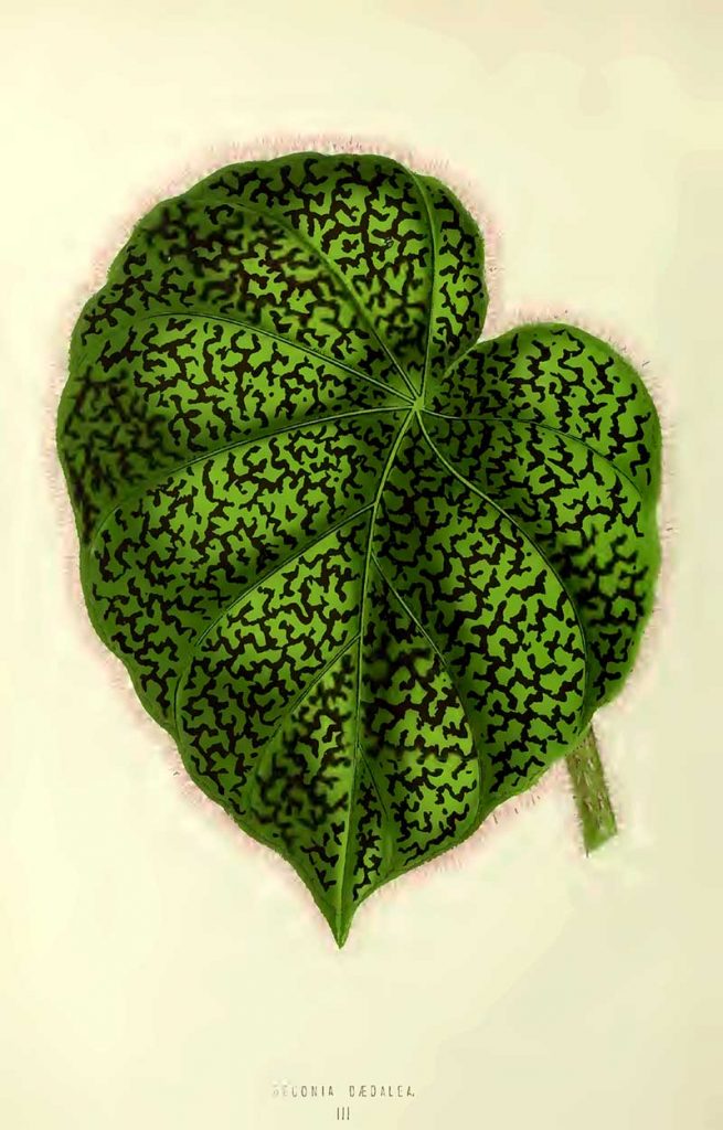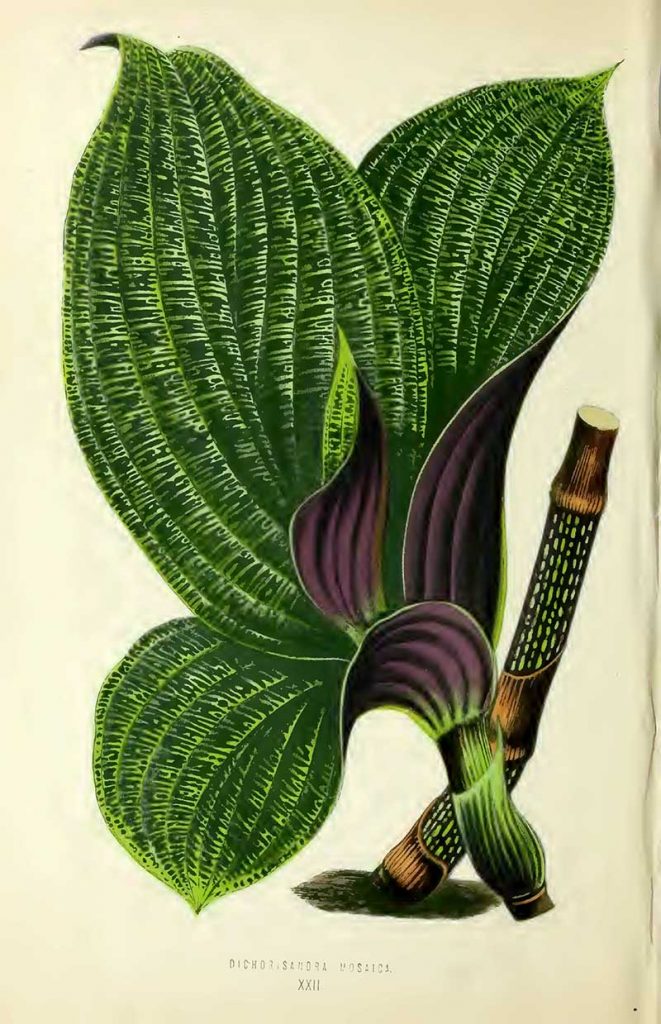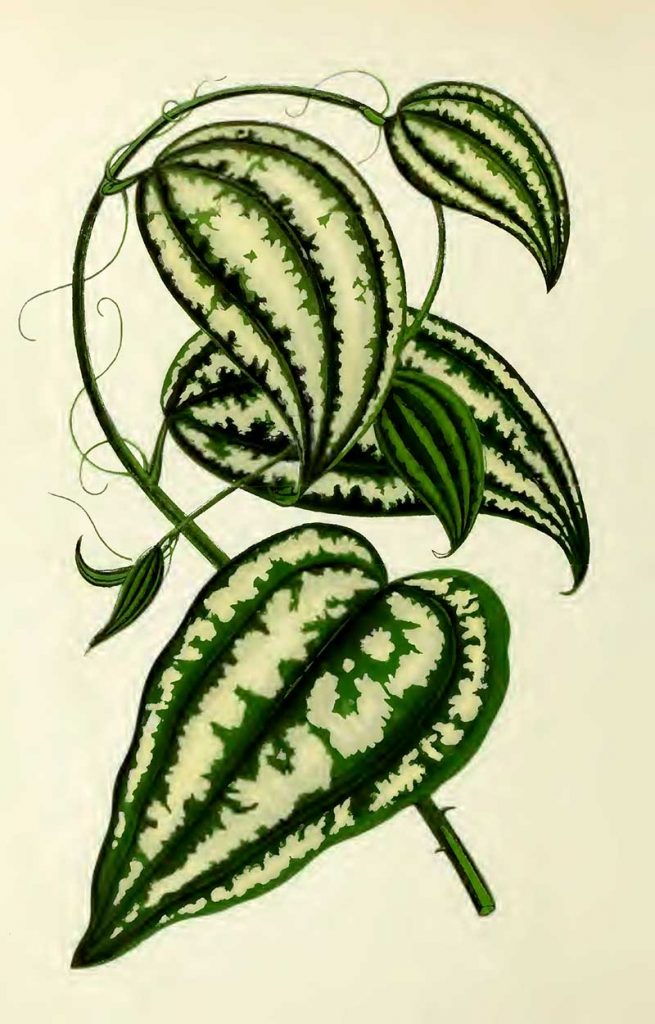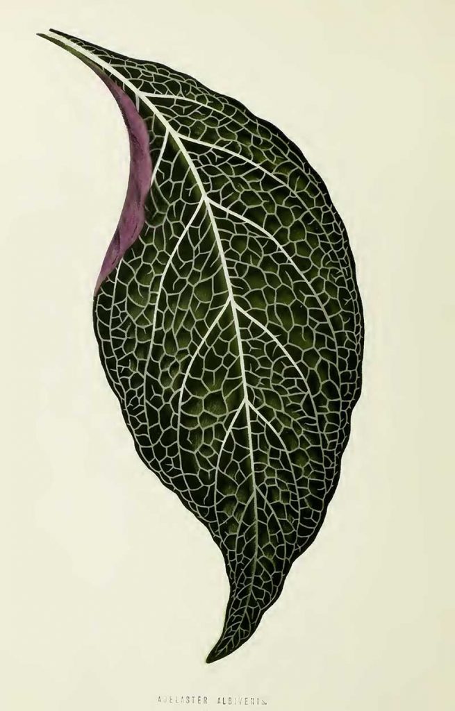 “The leaves are broadly ovate_oblong: the grand-color dark green, traversed with zigzag lines of white which remind the beholder of a delicate pattern in mosaic.“