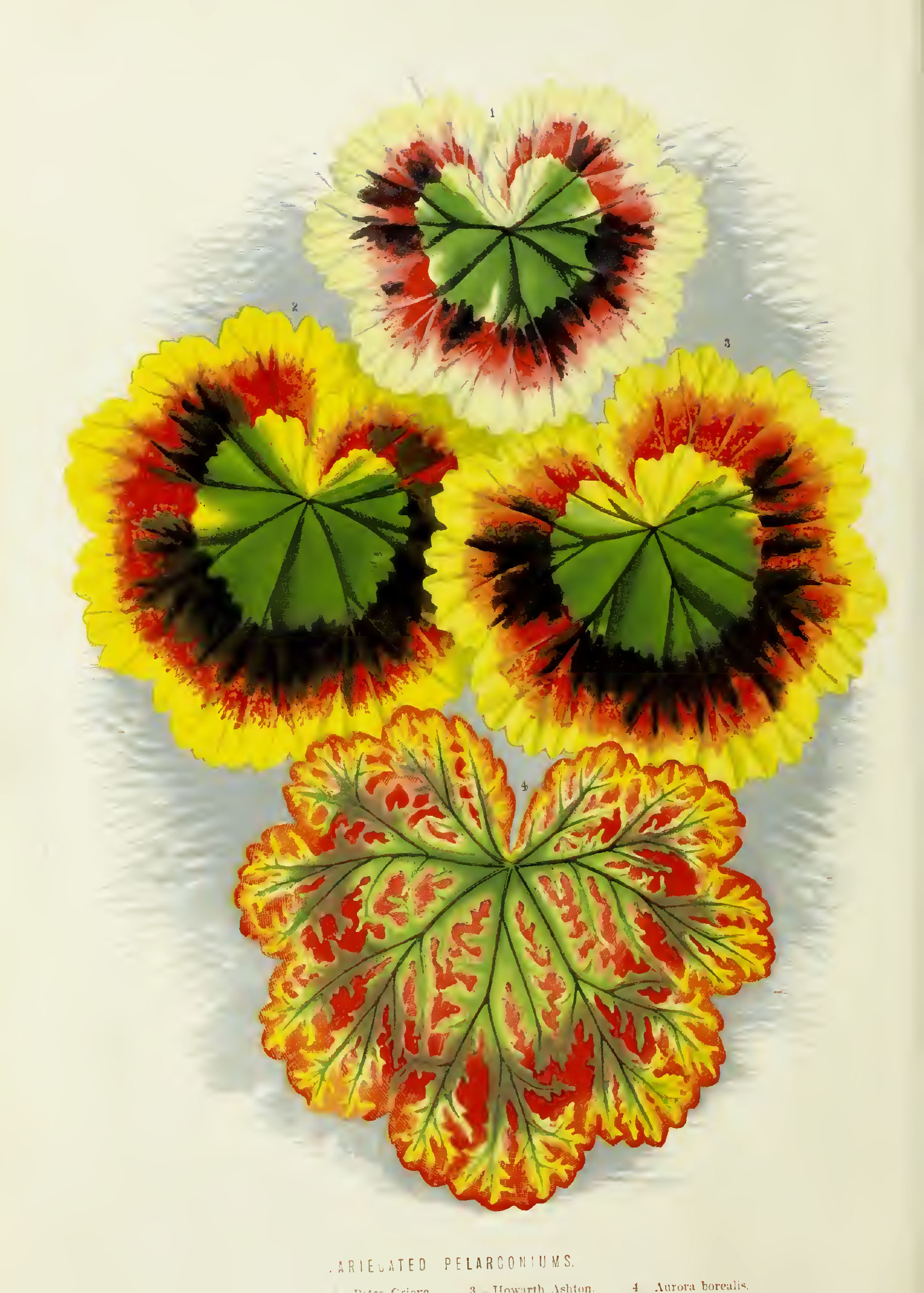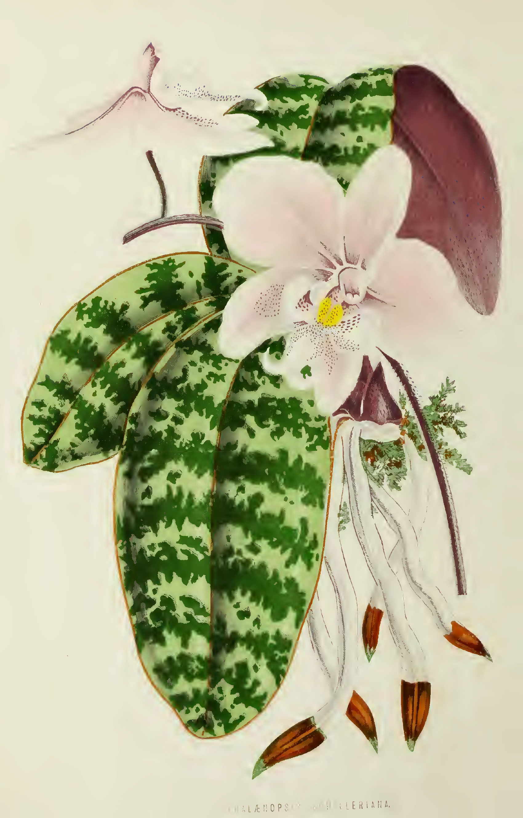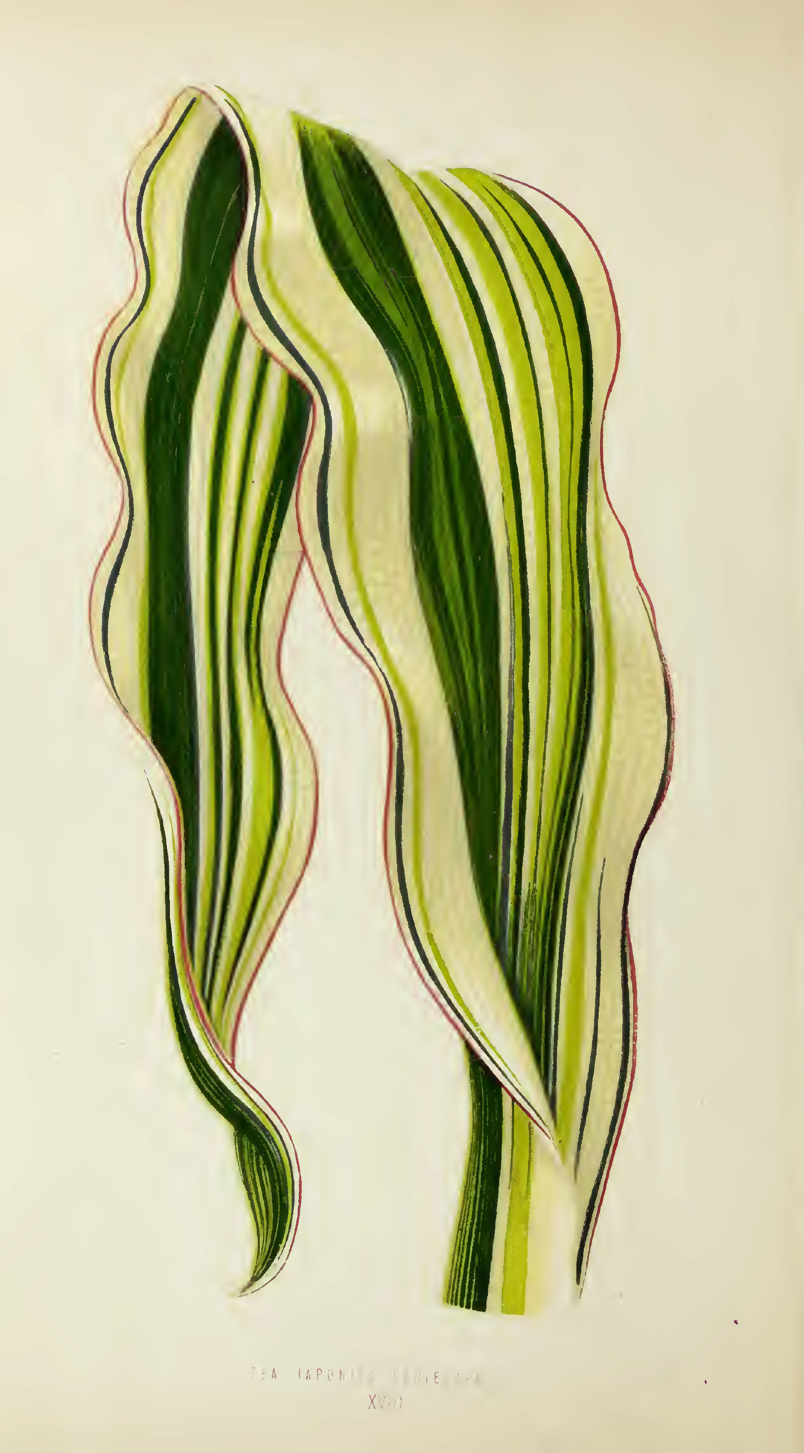 “The leaves are broadly ovate_oblong: the grand-color dark green, traversed with zigzag lines of white which remind the beholder of a delicate pattern in mosaic.“