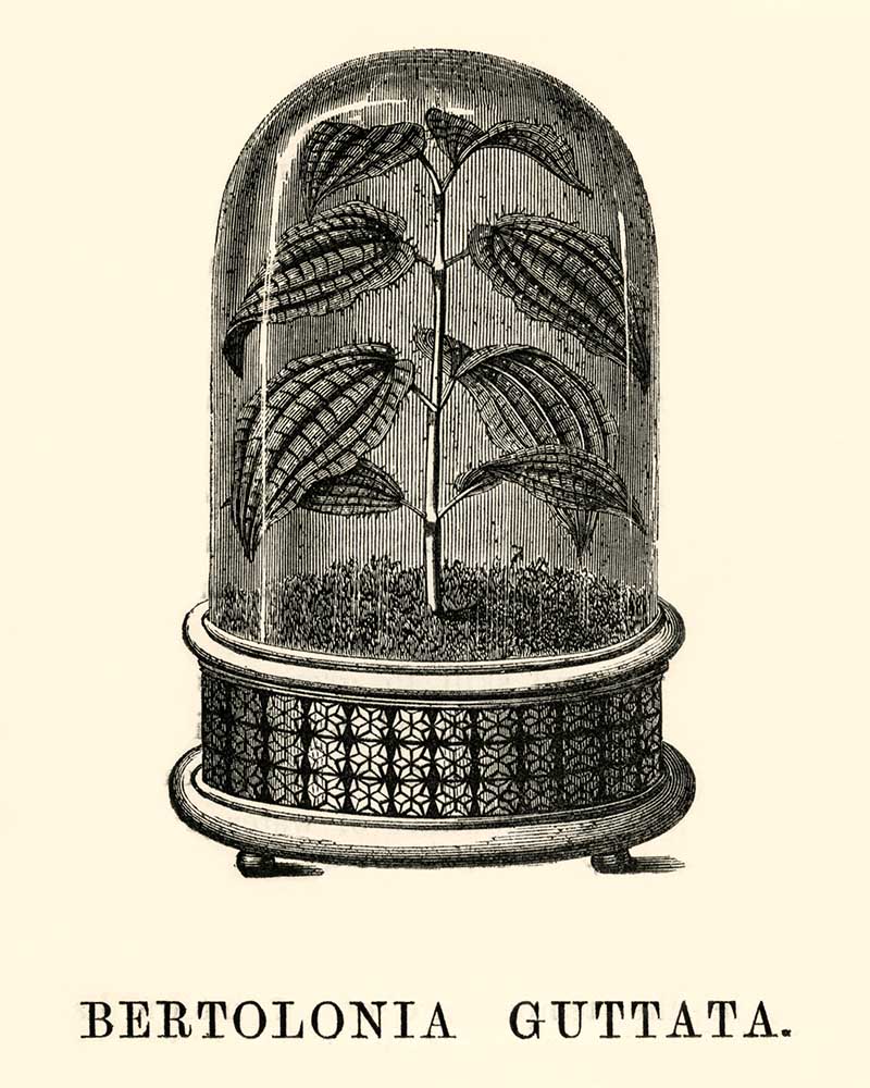 This particular dwarf tropical house plant is displayed in a cloche, which helps with humidity.