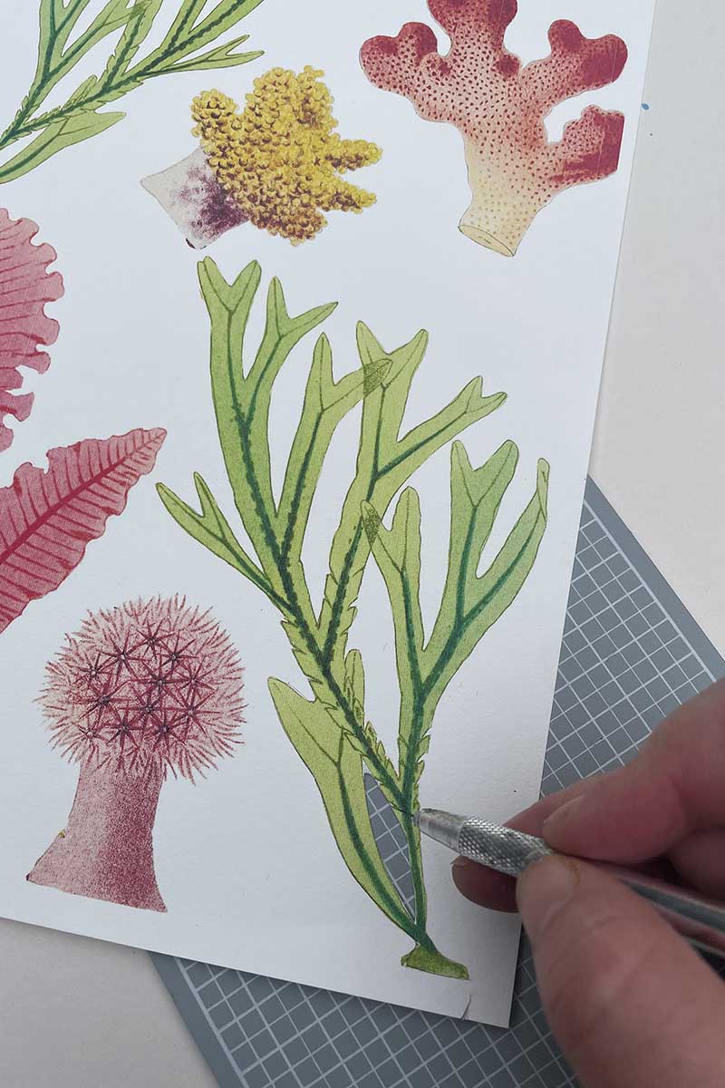 Step 4: Decide on what sea life images you want to use and print them onto watercolour paper. Then using a paper craft knife and mat, cut them out.