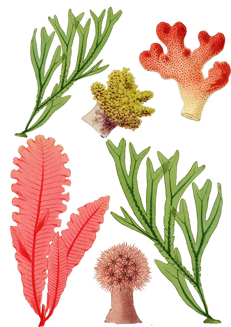This site has many fantastic vintage sea life images in the Public Domain; I can use for the collage, from the artistic Haeckel Jellyfish to Mawe’s conchology prints. But I focused on fish, seaweed and some coral.