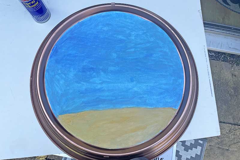 Step 3: Cut a piece of watercolour paper to fit the face of the clock. Using watercolour paints, paint a blue sea background with a sandy sea bed. This was stuck to the clock face with a spray mount.