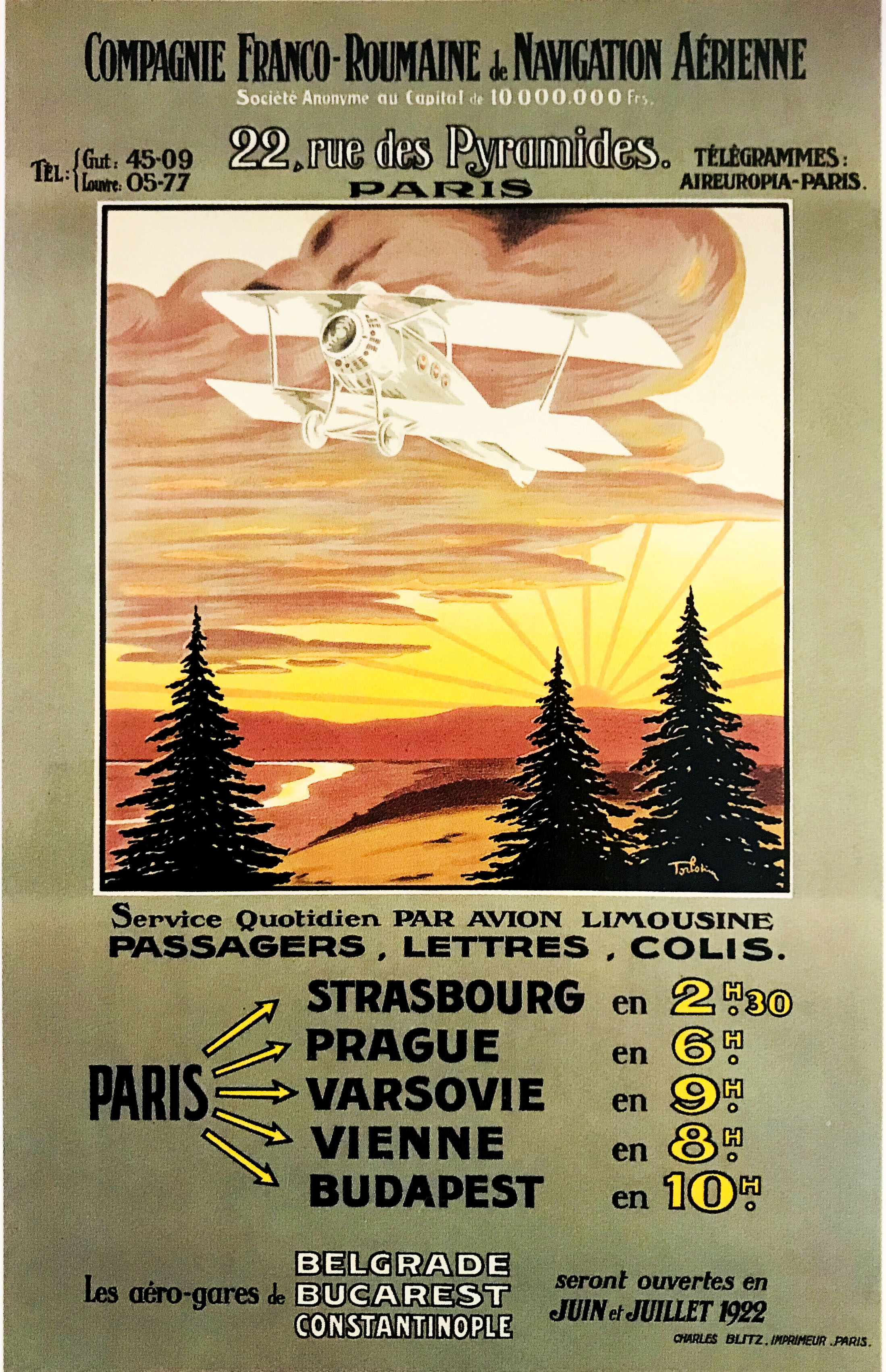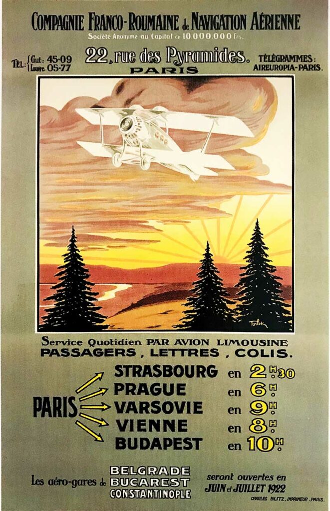 Compagnie franco-roumaine de navigation aérienne (CFRNA). 1920s poster showing the airlines’ routes from Paris and flying times.