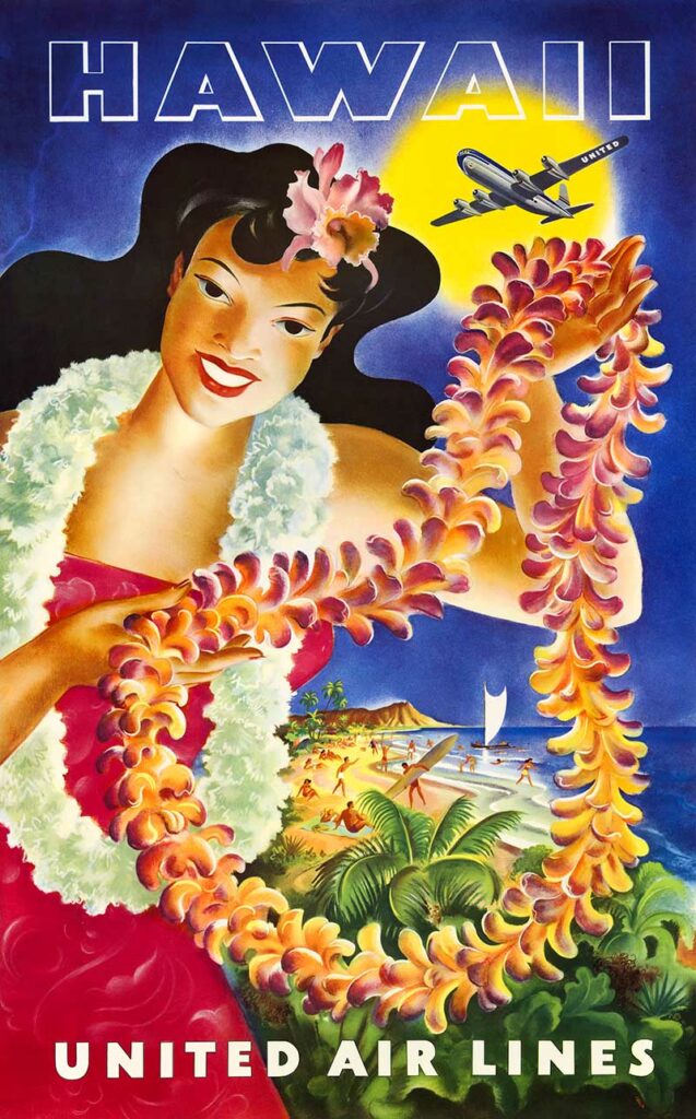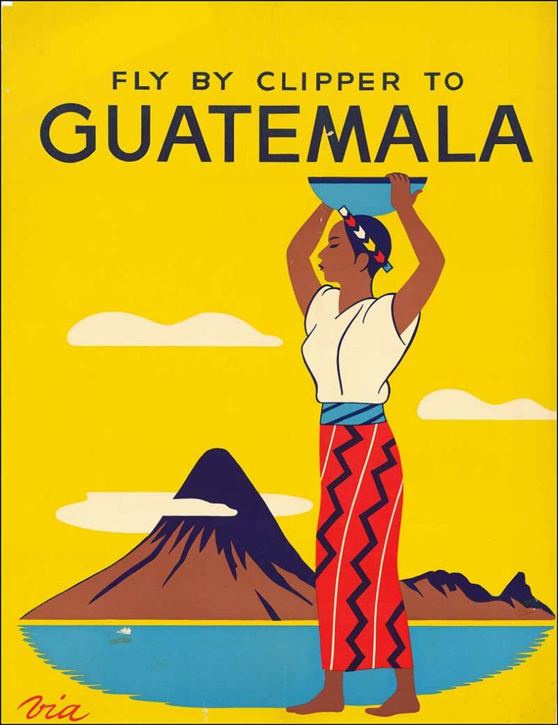 A 1955 travel poster advertising a destination on the Pan Am Clipper route above.
