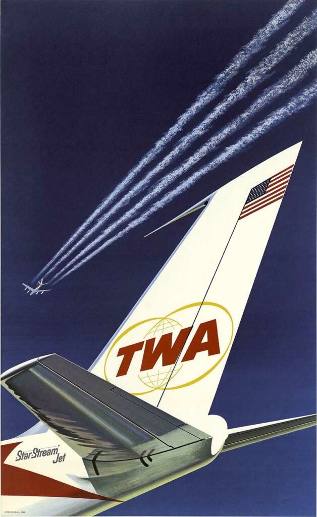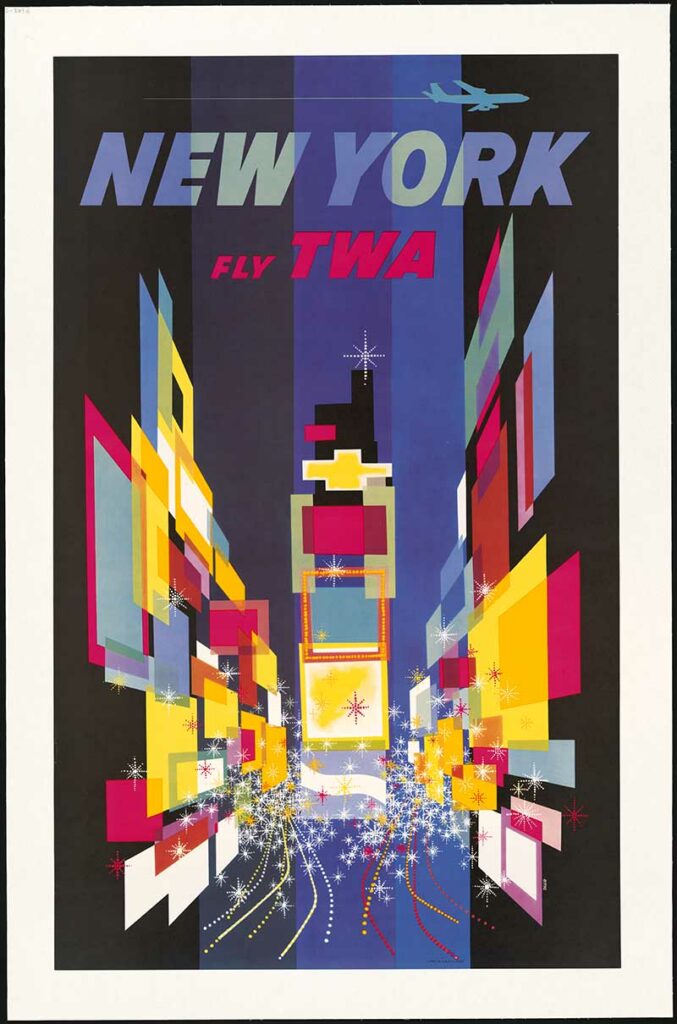 The vintage airline poster is from the 1960s and shows an abstract interpretation of Times Square in New York with a TWA jet and jetstream at the top of the image.
