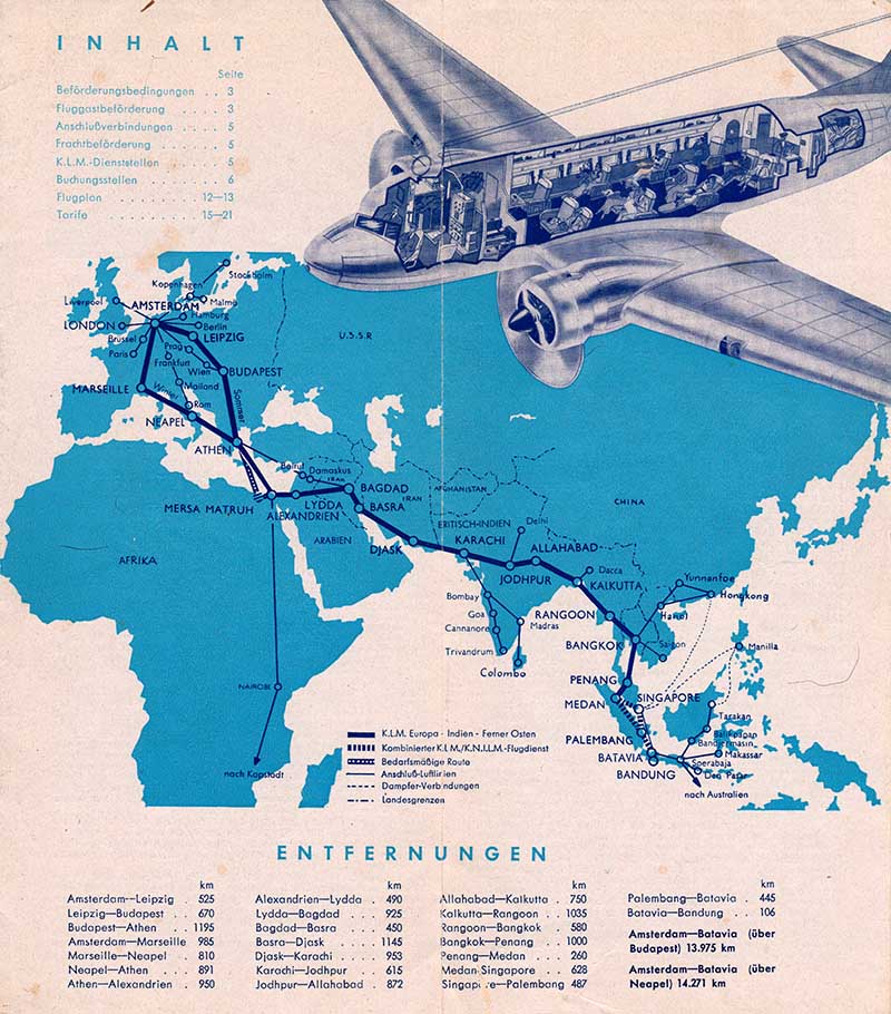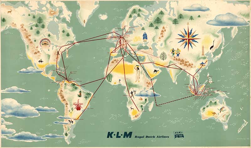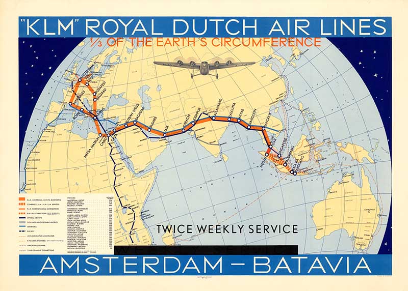 1934 Advertisement for KLM Royal Dutch Airlines. Depicting a map of the world in global shape, it shows KLM and other airlines’ service routes. The map includes routes from Amsterdam to Batavia via Amsterdam, London, Athens, Cairo, Baghdad, Karachi, Calcutta, Rangoon, Bangkok, Medan, Singapore, and Batavia.