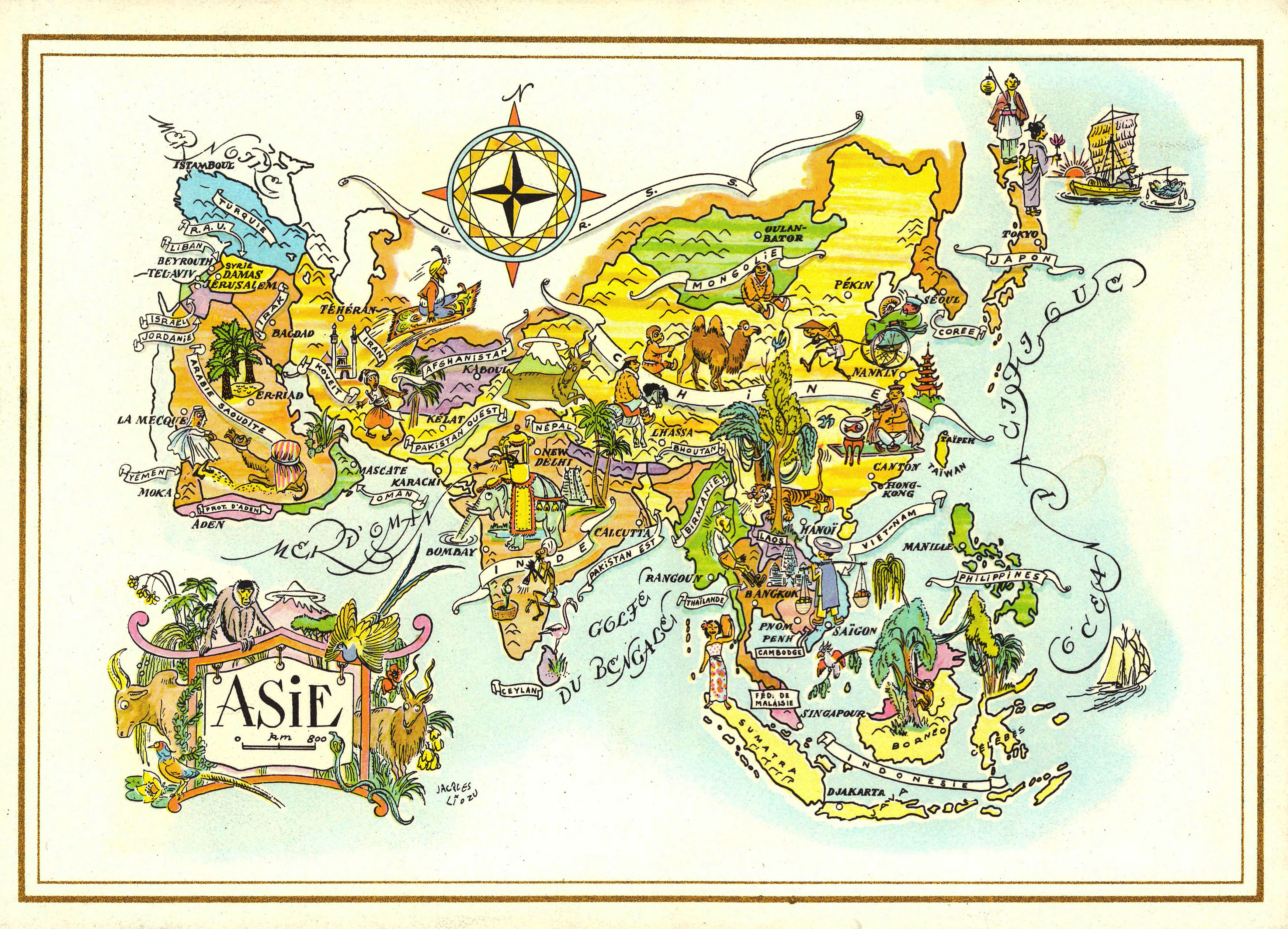 A beautifully illustrated map of Asia was featured on the menu cover at Pan Am. The pictorial map is by the French illustrator Jacques Liozu.