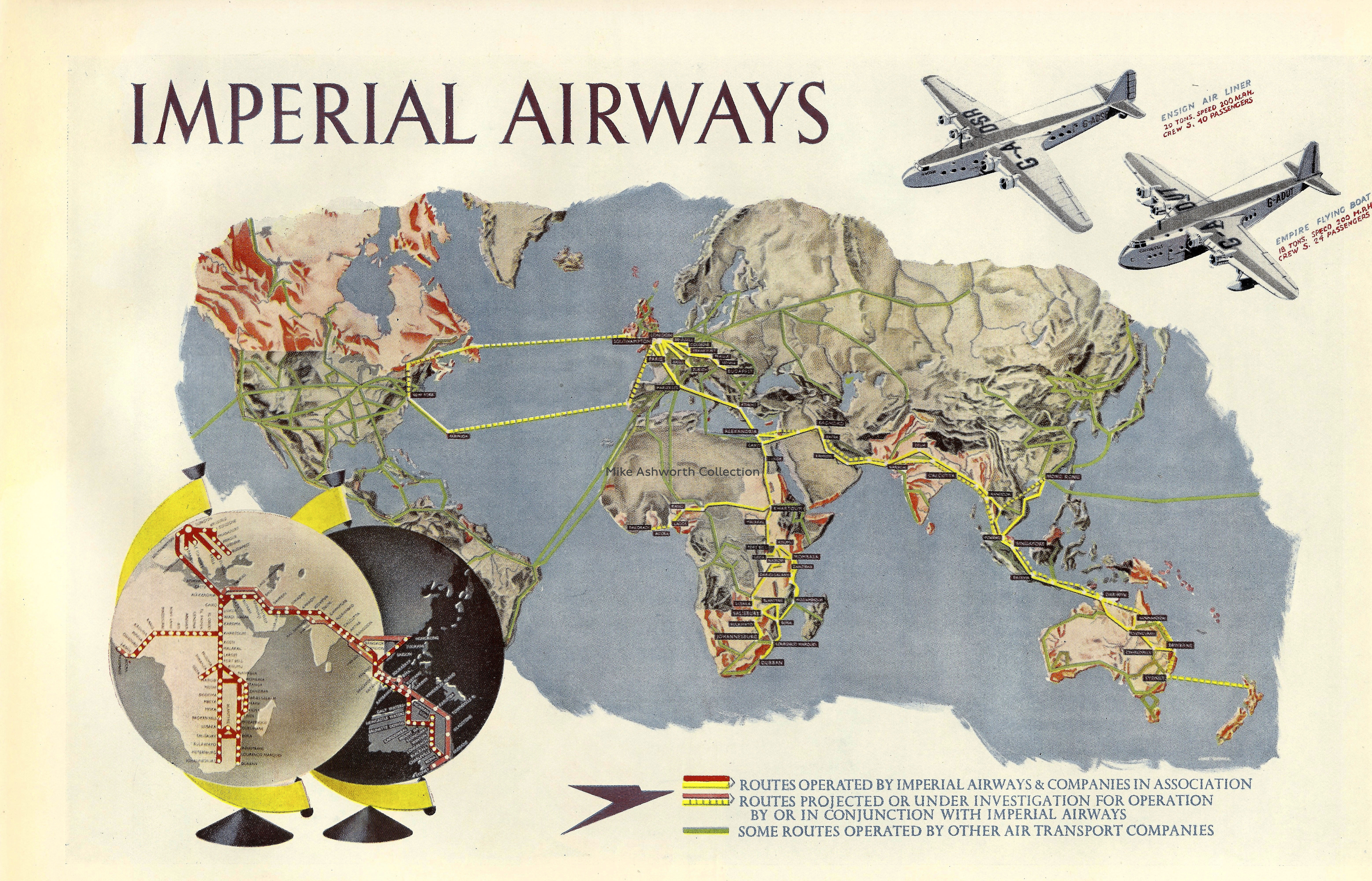 1937 global spread of the routes of Imperial Airways. Imperial Airways later became BOAC and then British Airways.