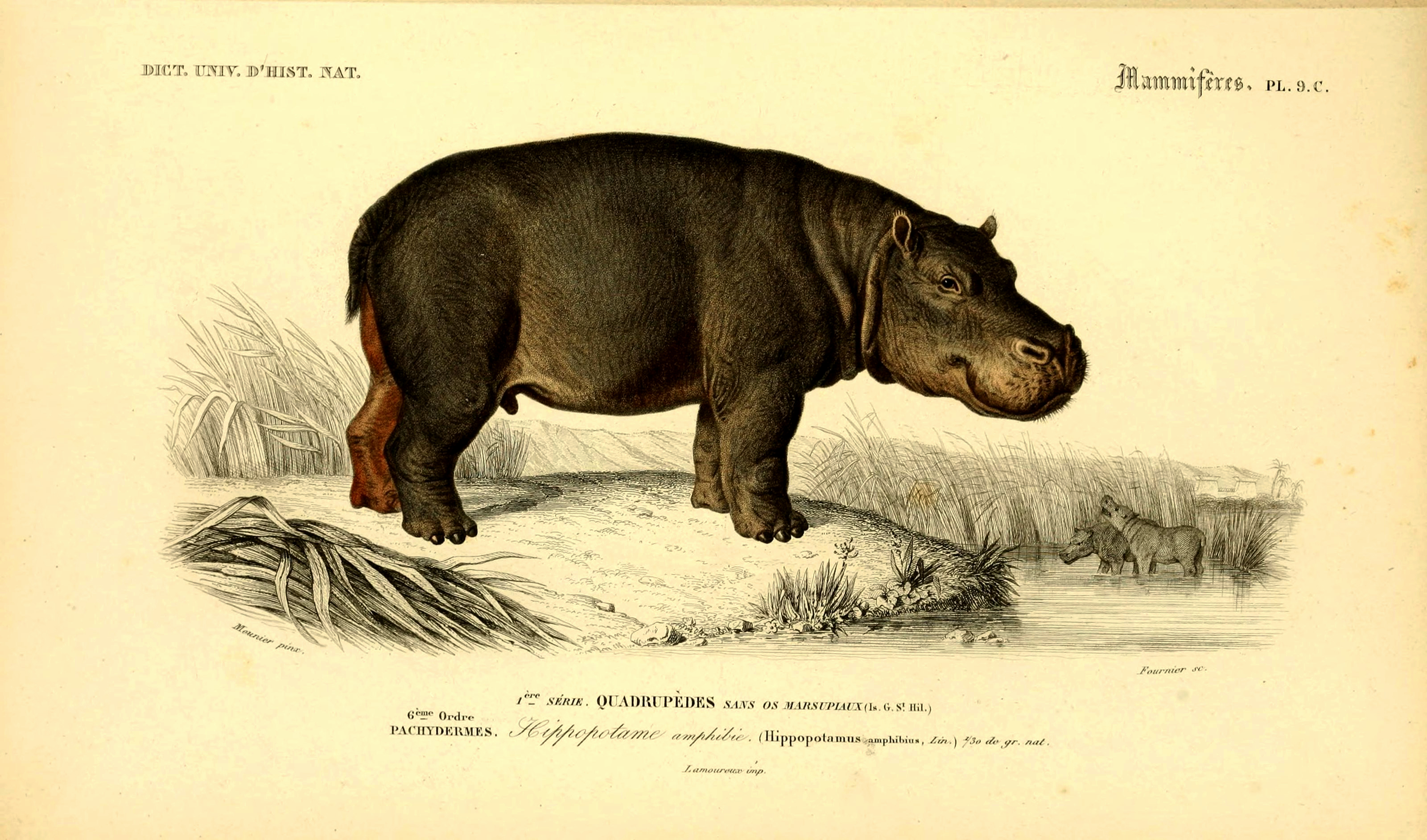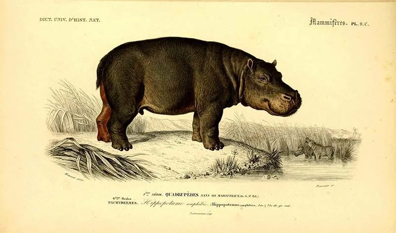 Another mammal that is native to sub- Saharan Africa. The name hippopotamus derives from the ancient Greek word for “river horse”. Hippos are the third-largest land mammals, after the elephant and rhino.