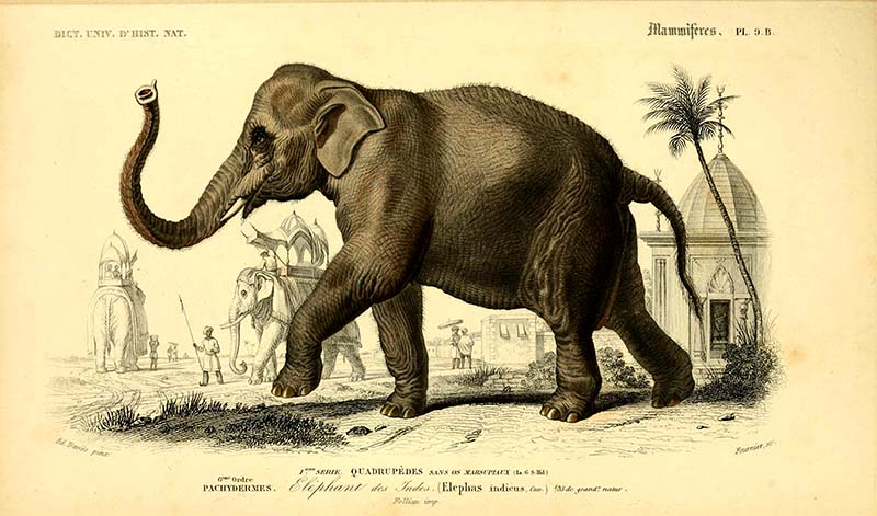 Like with many of Charles D’ Orbigny’s vintage animal prints, it’s the details in the background that make them special. This print is no exception, with the temple and ceremonial elephants in the background.
