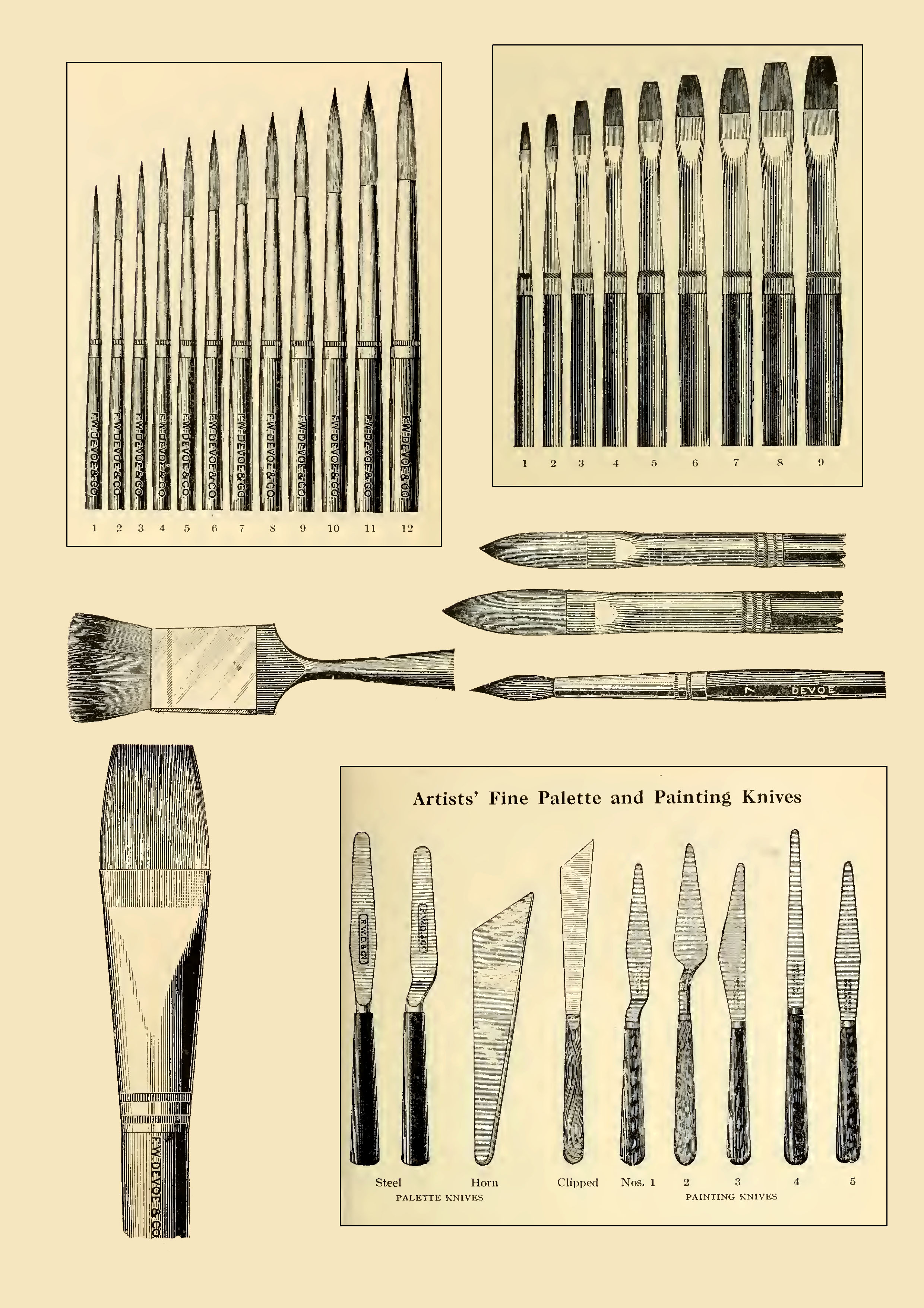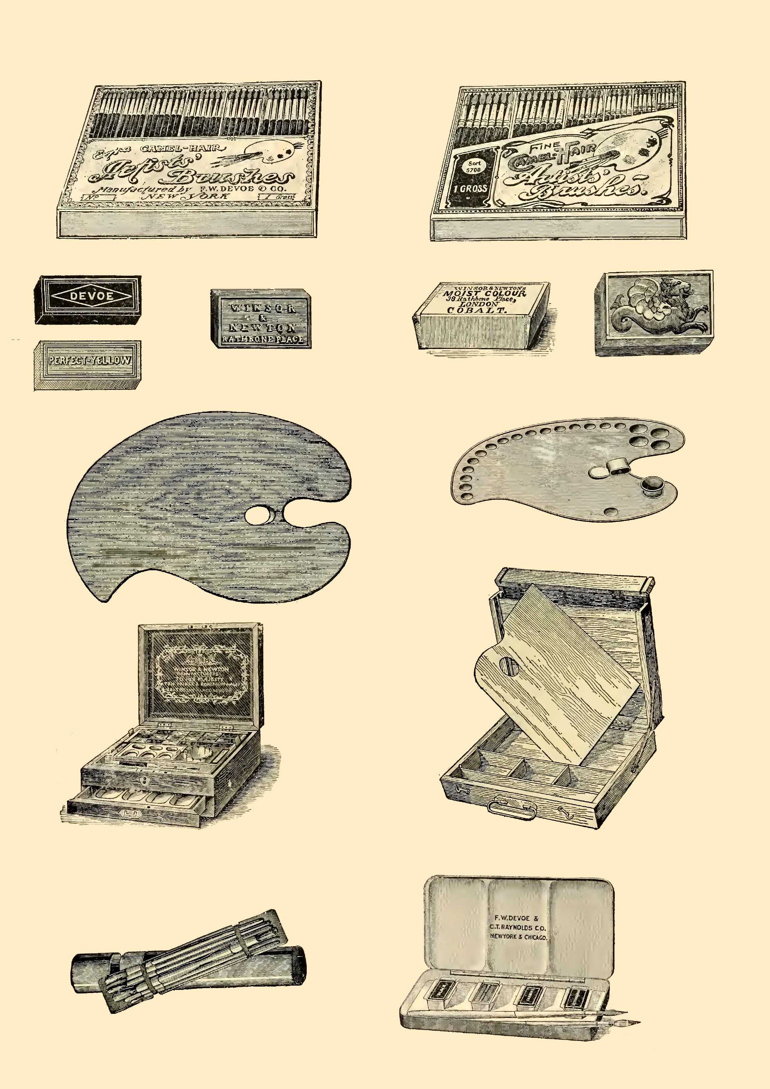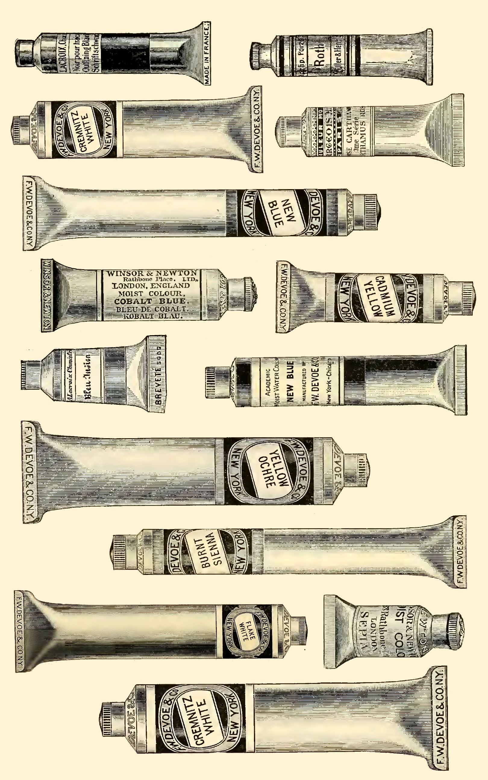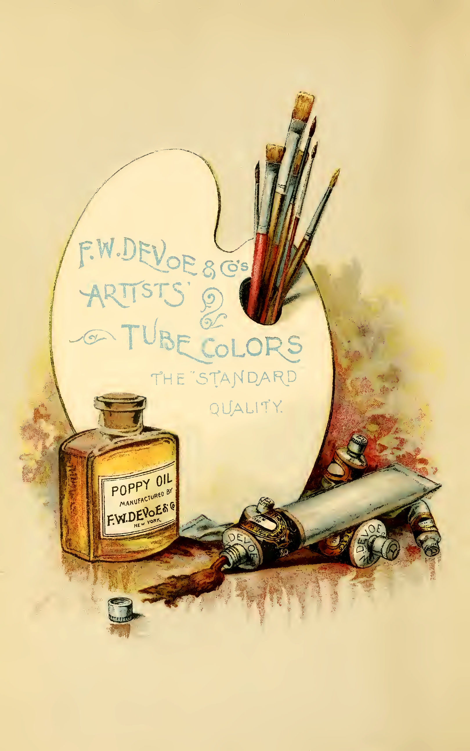 “Devoe’s & Co’s tube paints are prepared from carefully selected pigments- foreign or their own make- thoroughly incorporated with the purest oil. An objection is frequently made to the thin condition of many tube paints ground by foreign makes; by Devoe’s system they secure that firm consistency and fineness of texture required by artists.”
