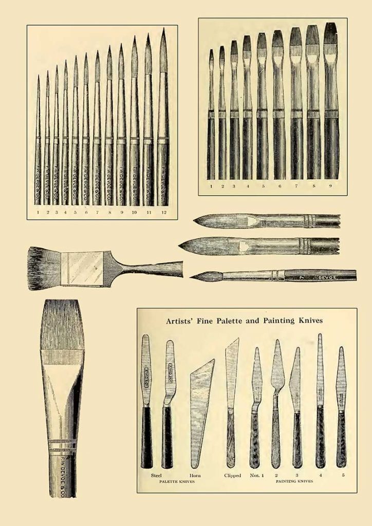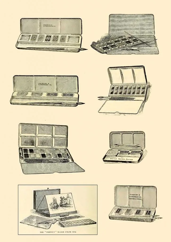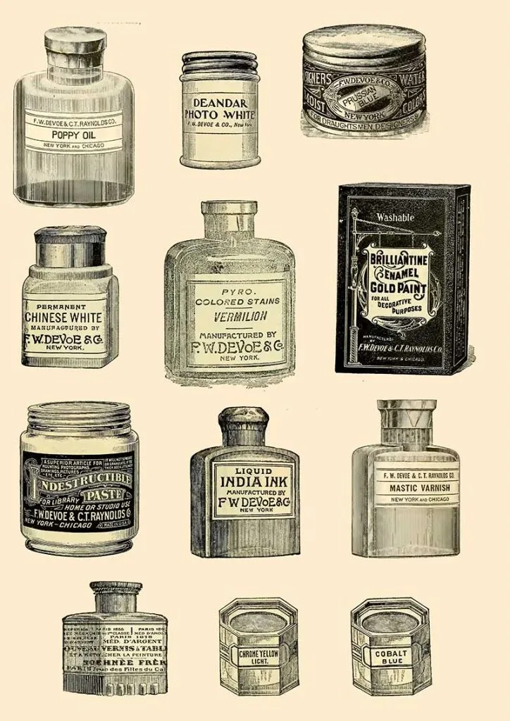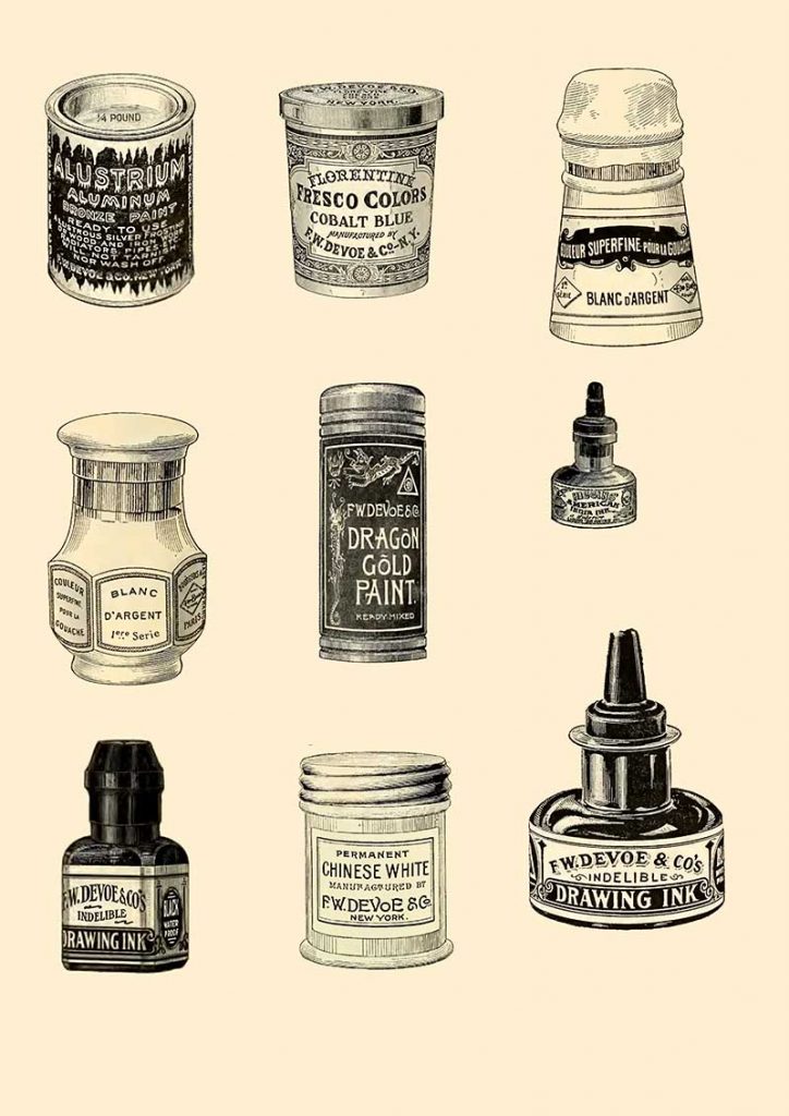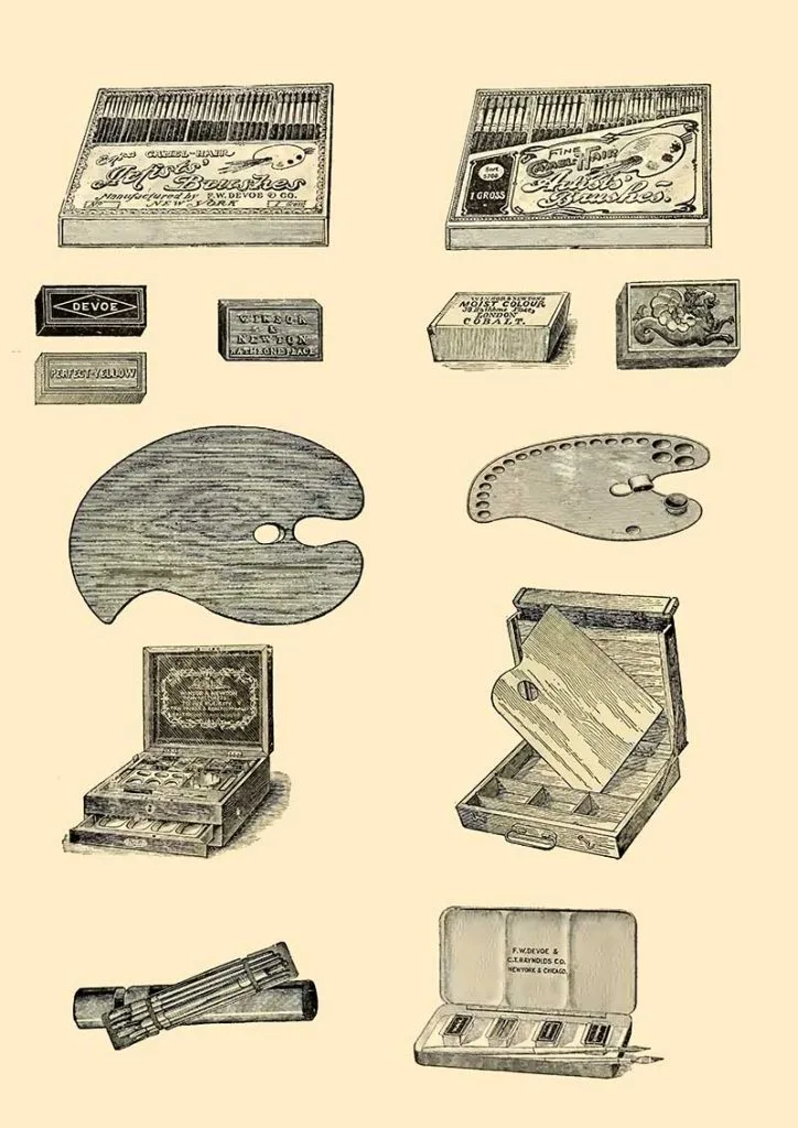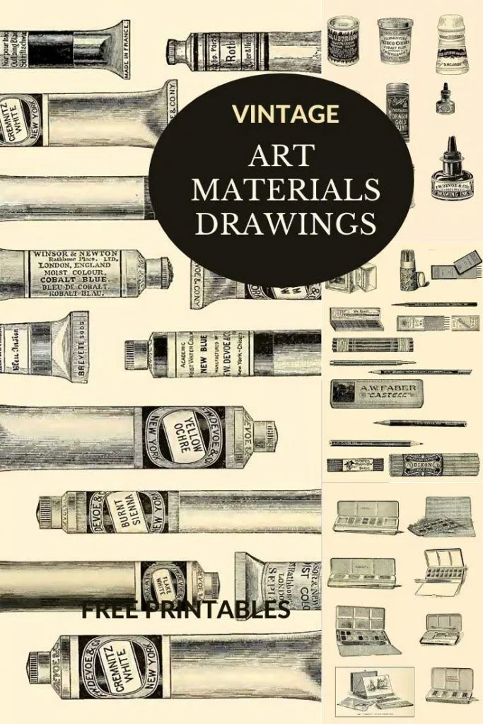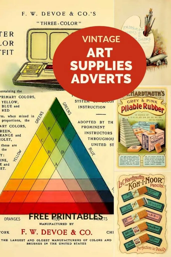 All the images of vintage art supplies and the art adverts are from a 1914 catalog. “Priced catalogue of artists’ materials: supplies for oil painting, watercolor painting, china painting … and drawing materials for architects and engineers, manual training schools and colleges.”