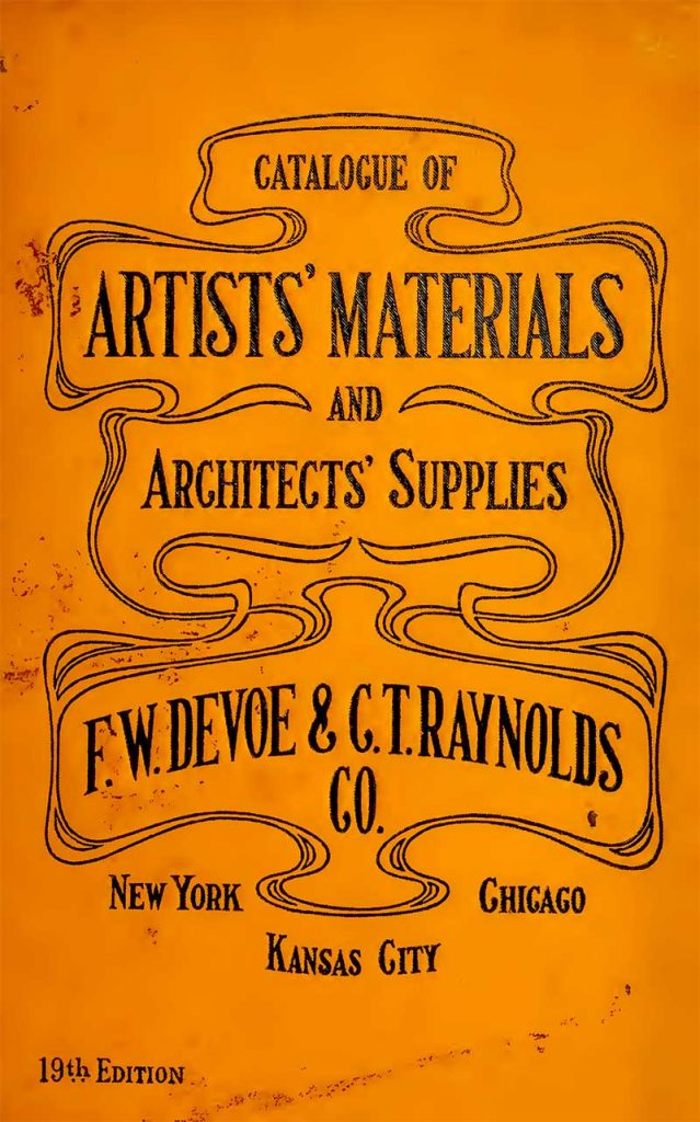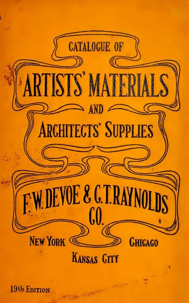 The art supplies catalog was published by Devoe & Raynolds Co., Inc New York N. Y. They were America’s first and oldest paint company founded in 1754. The companies manufacturing base at the time of print was in New York. The company was bought by the Celanese Corporation in 1964.