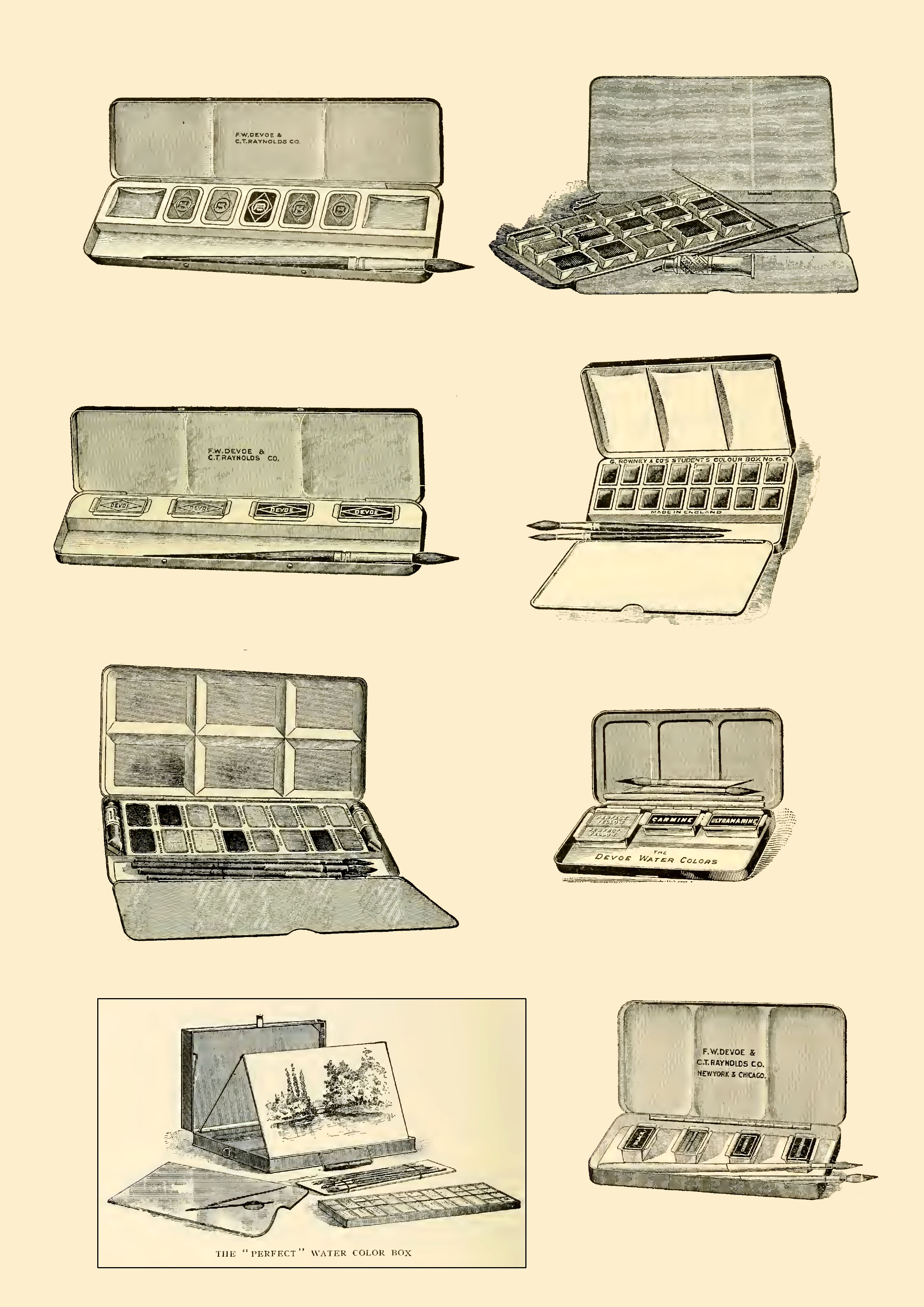 There are many watercolor and oil-based paint boxes in the catalog. Here are just a selection of them. There is another poster of them below and a color advert at the end of the post.