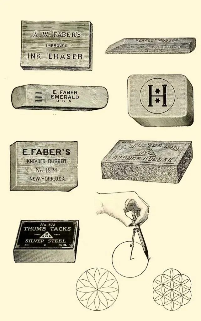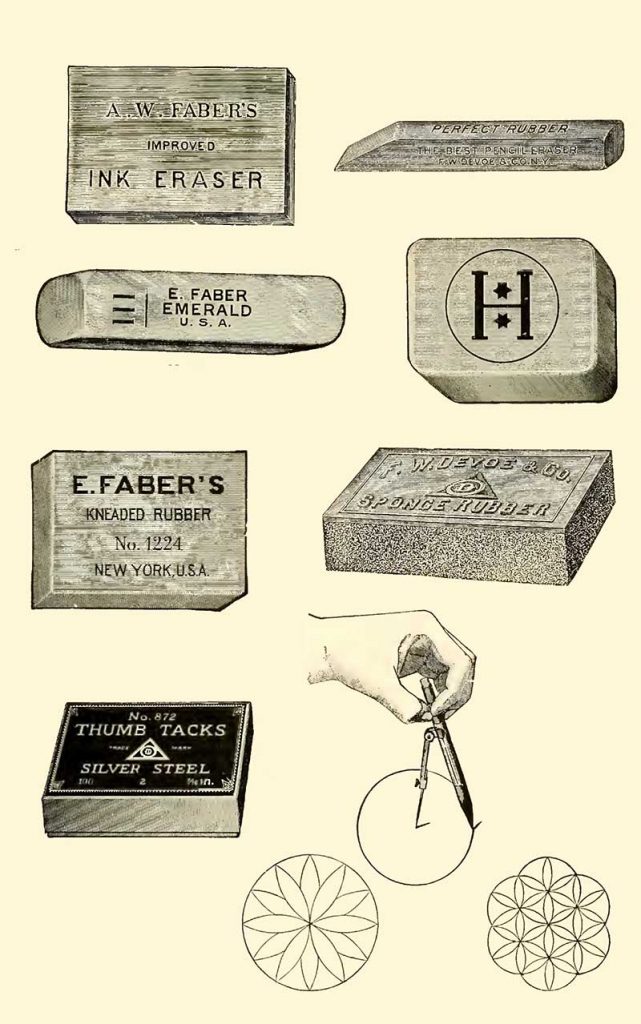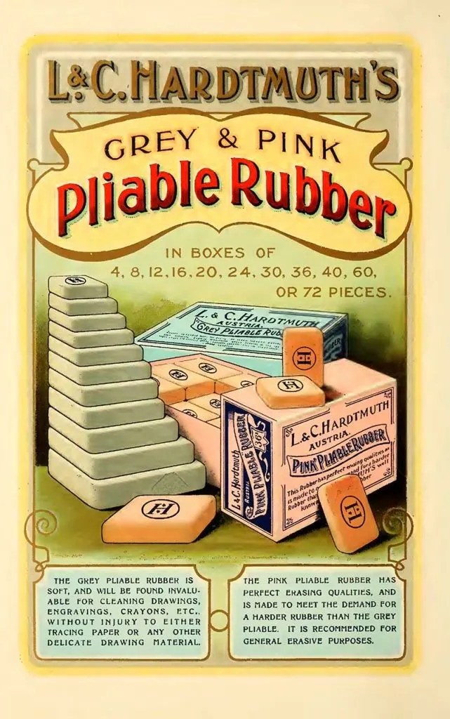 Hardmuth’s Pink Pliable Rubber: “This rubber is soft and pliable and will erase pencil marks easily without injury to Tracing Paper or other delicate material in boxes“.