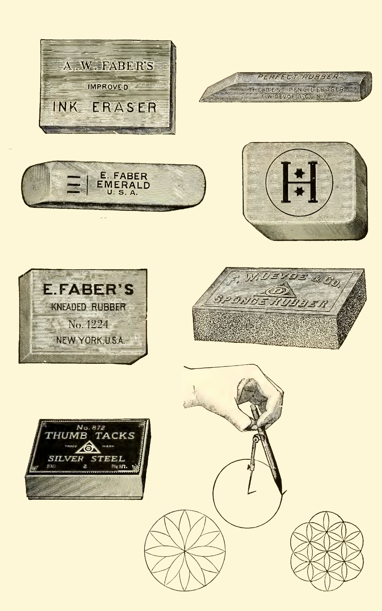 A collection of different types of erasers and rubbers in the catalog. The poster also includes a compass and some thumbtacks.