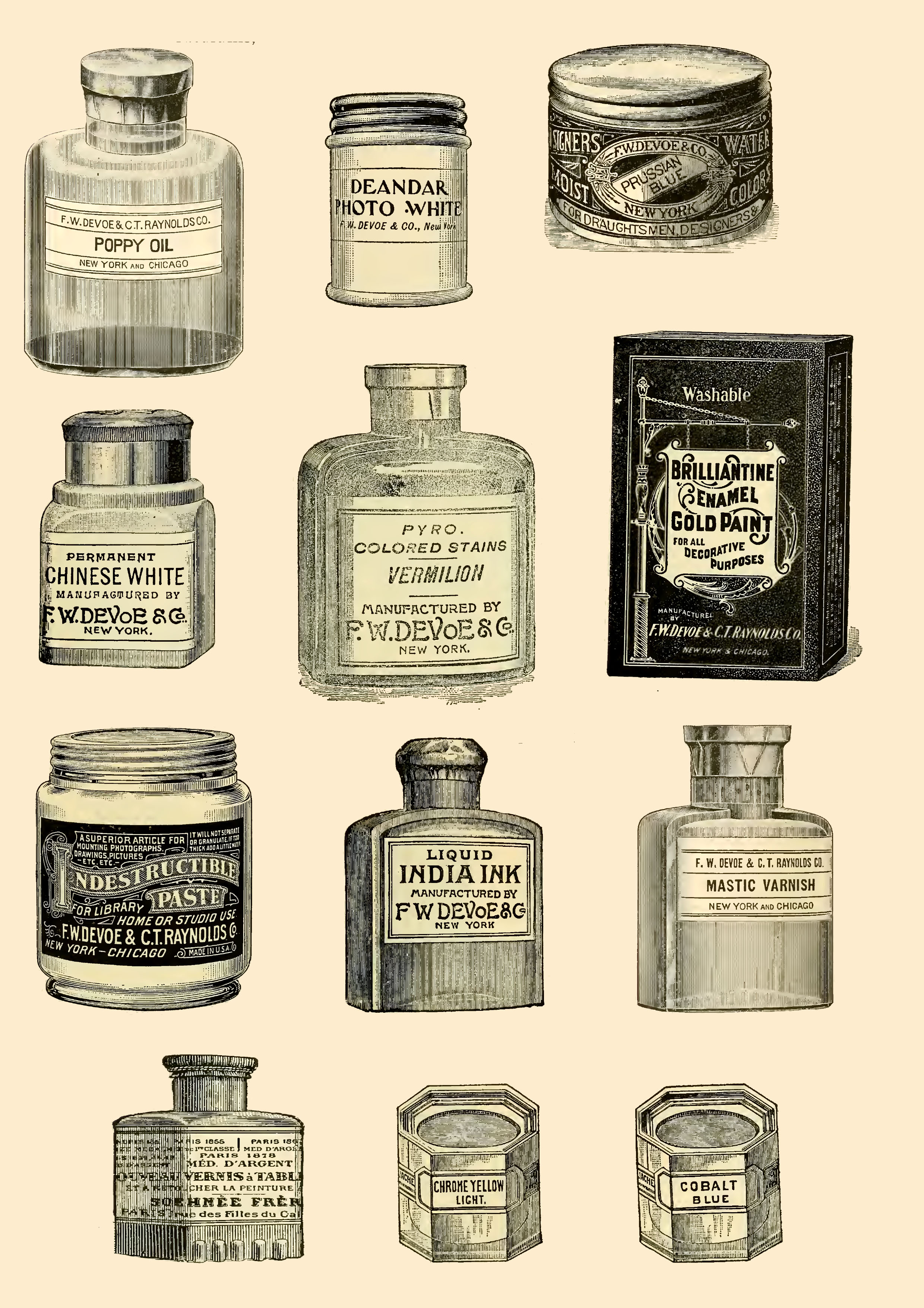 One of 2 poster collections of vintage art supplies in bottles, pots and jars. From specialist paints, drawing inks to oils and varnishes.