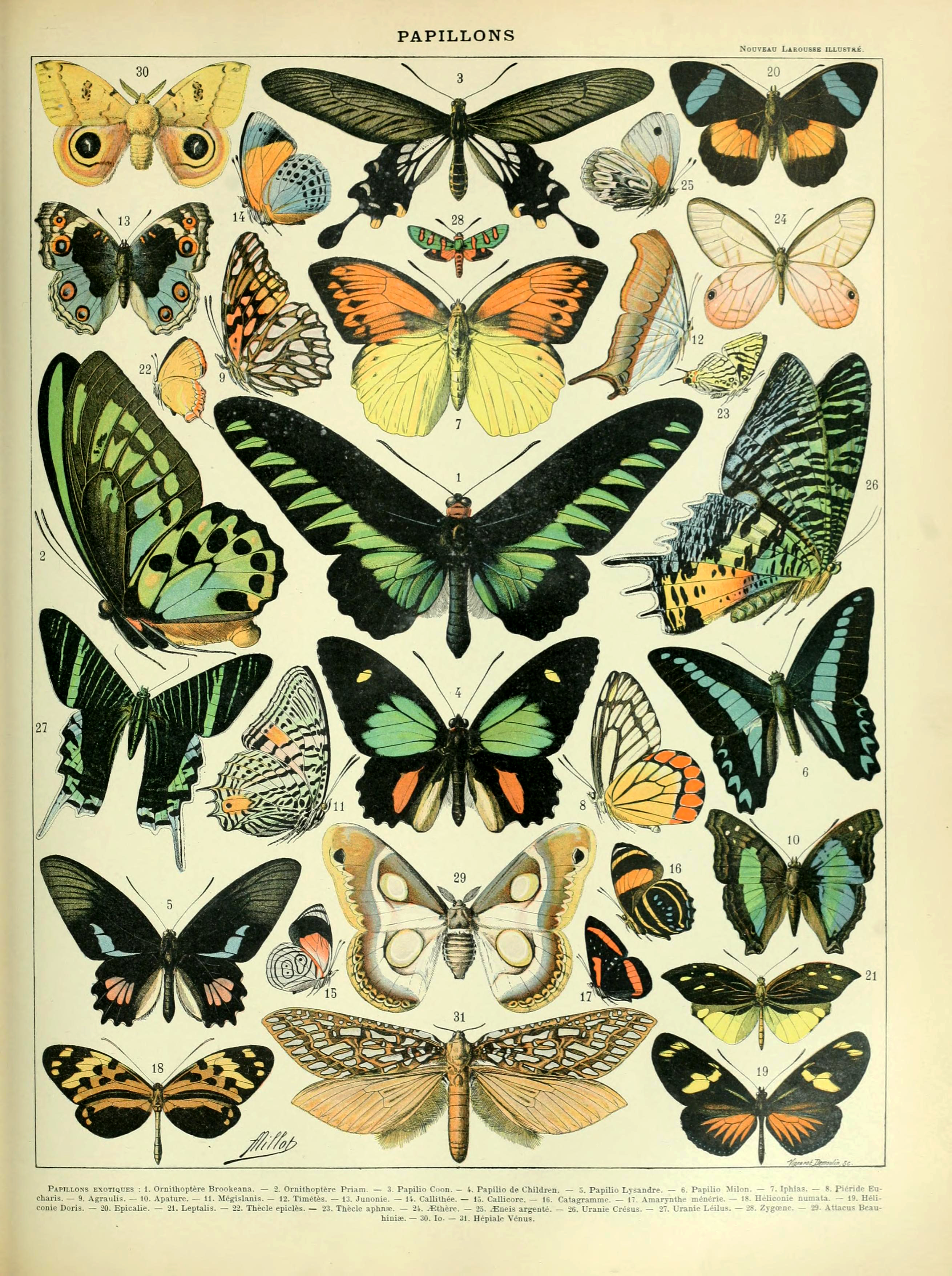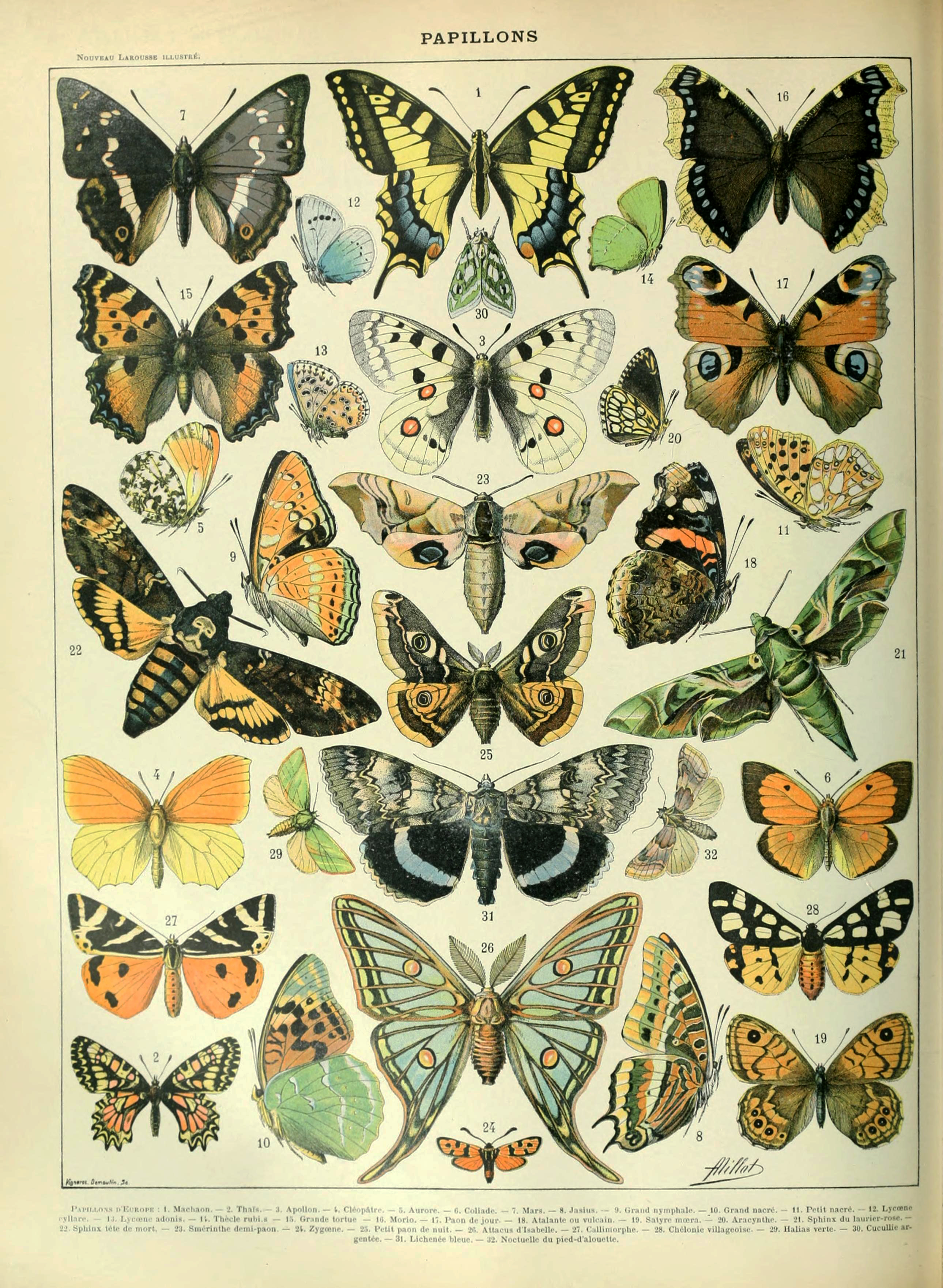 Thirty-two beautiful vintage butterfly images in this first of 2 natural history posters. Adolphe Millot painted them for the “Nouveau Larousse illustré”. I’ve previously shared a collection of Millot’s Sea Life posters.