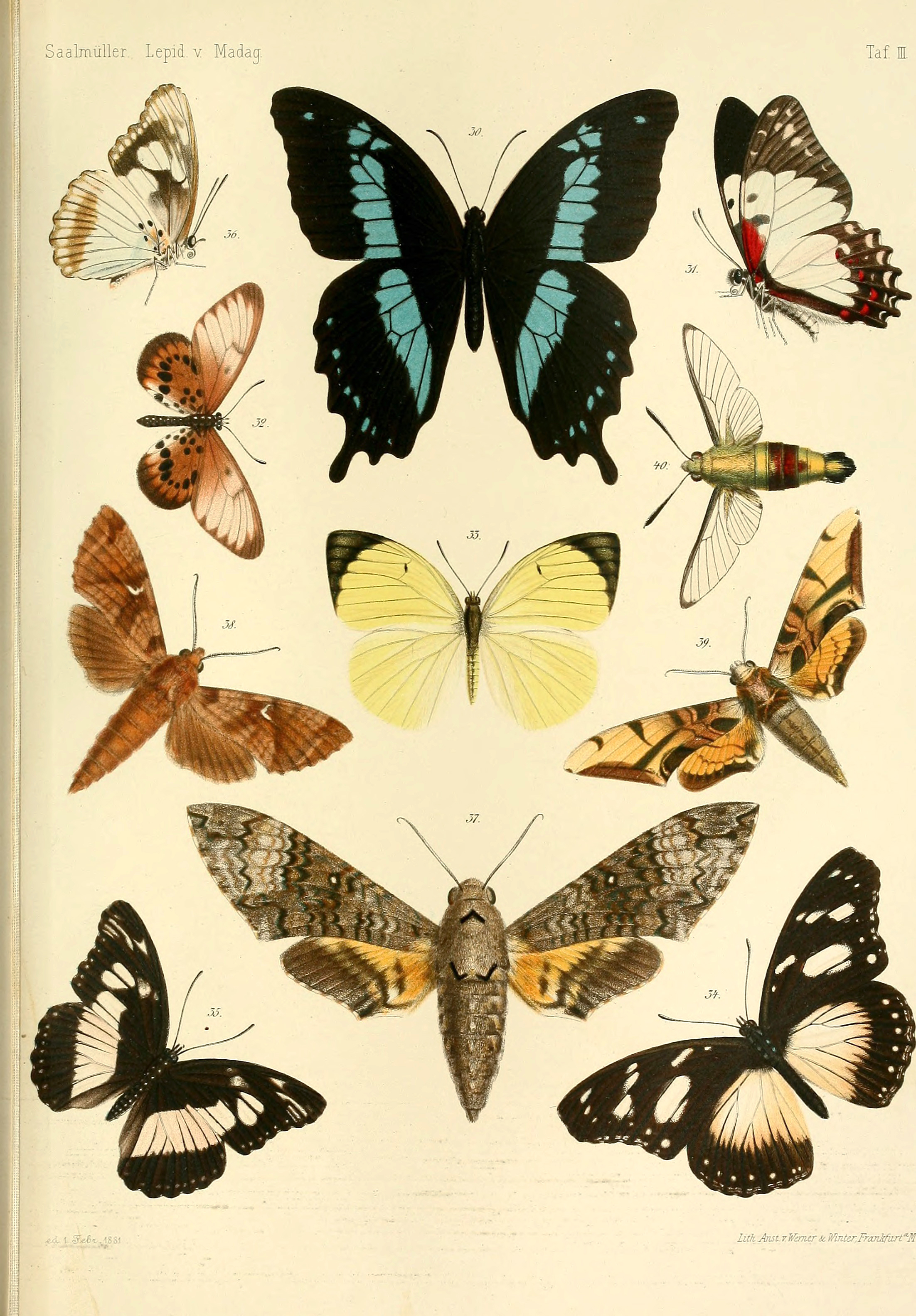 This beautiful plate of moth and butterfly images is from the German publication “Abhandlungen der Senckenbergischen Naturforschenden Gesellschaft” 1854. From Harvard University Library.