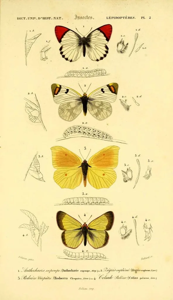 The second plate of butterfly images from Charles Orbigny’s book. Again with line drawings of each butterflies caterpillar state.