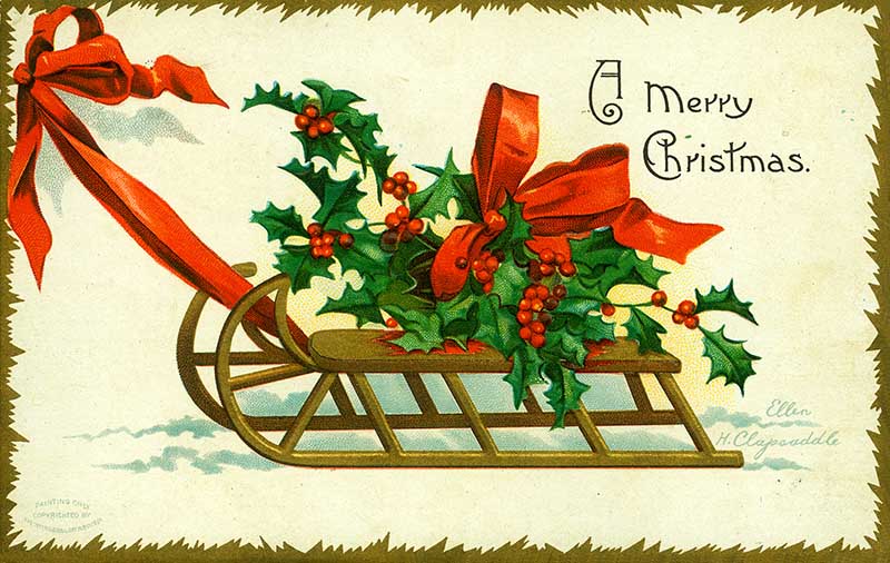 A 1907 vintage Christmas card image of a Christmas sledge in the snow laden with holy.