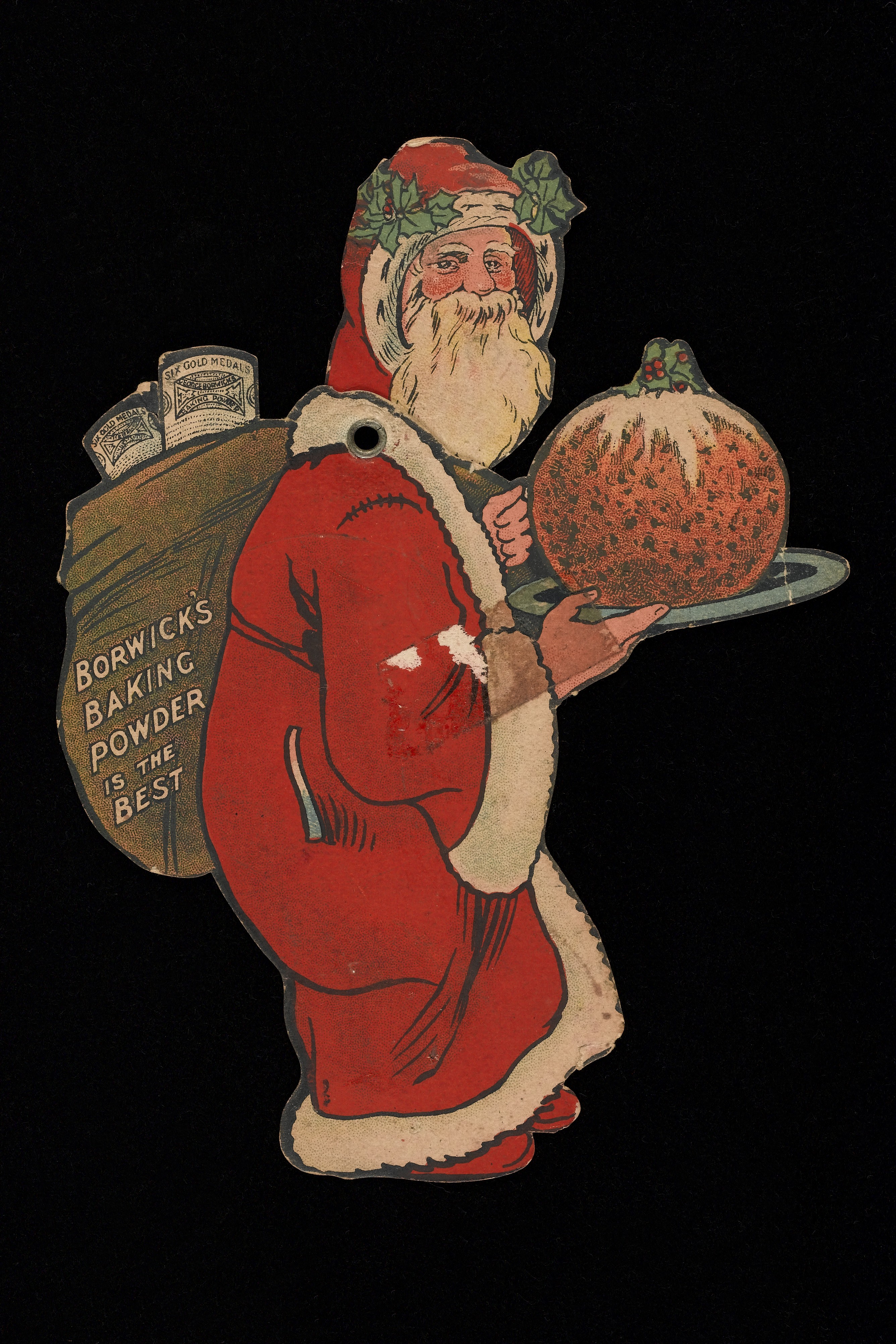 Advert for Borwick’s Baking Powder showing Father Christmas carrying a large Christmas pudding on a tray