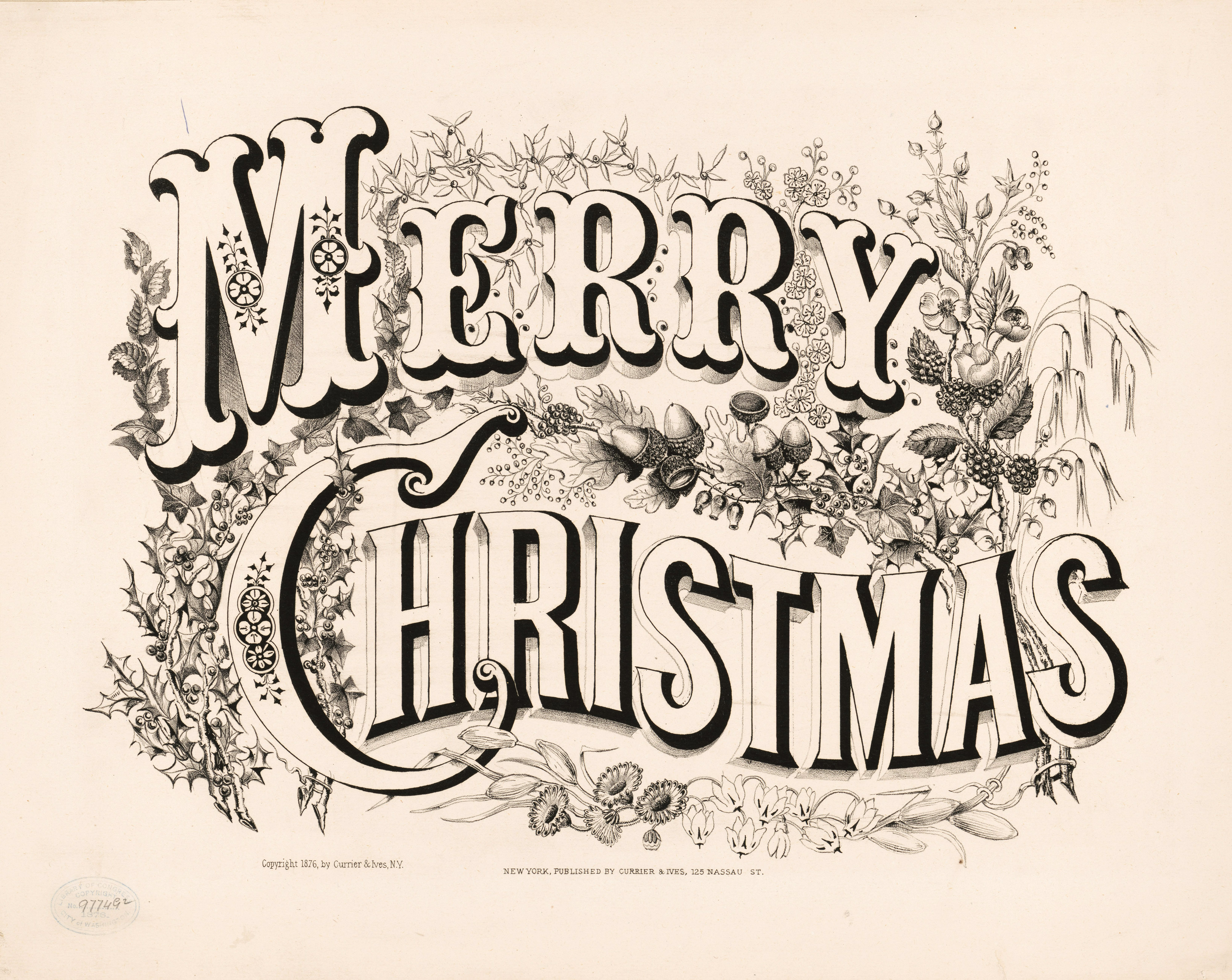 This is a beautiful piece of Christmas typography (1876) published by Currier & Ives. I love the acorns and other foliage wrapped around the text. This would be a great vintage Christmas image to colour in.