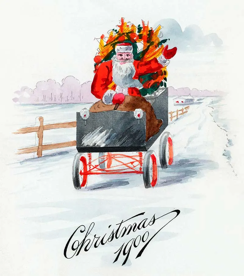 Another vintage Christmas image from a 1900 menu depicts Santa in a cart laden with presents.