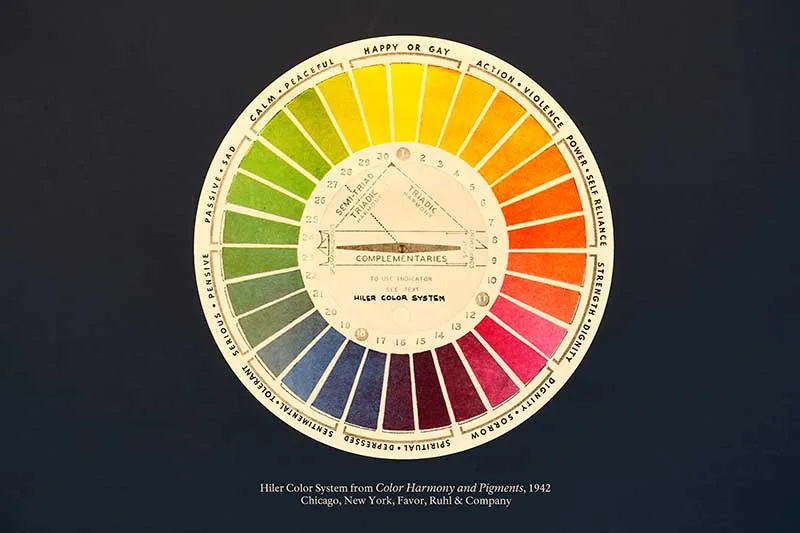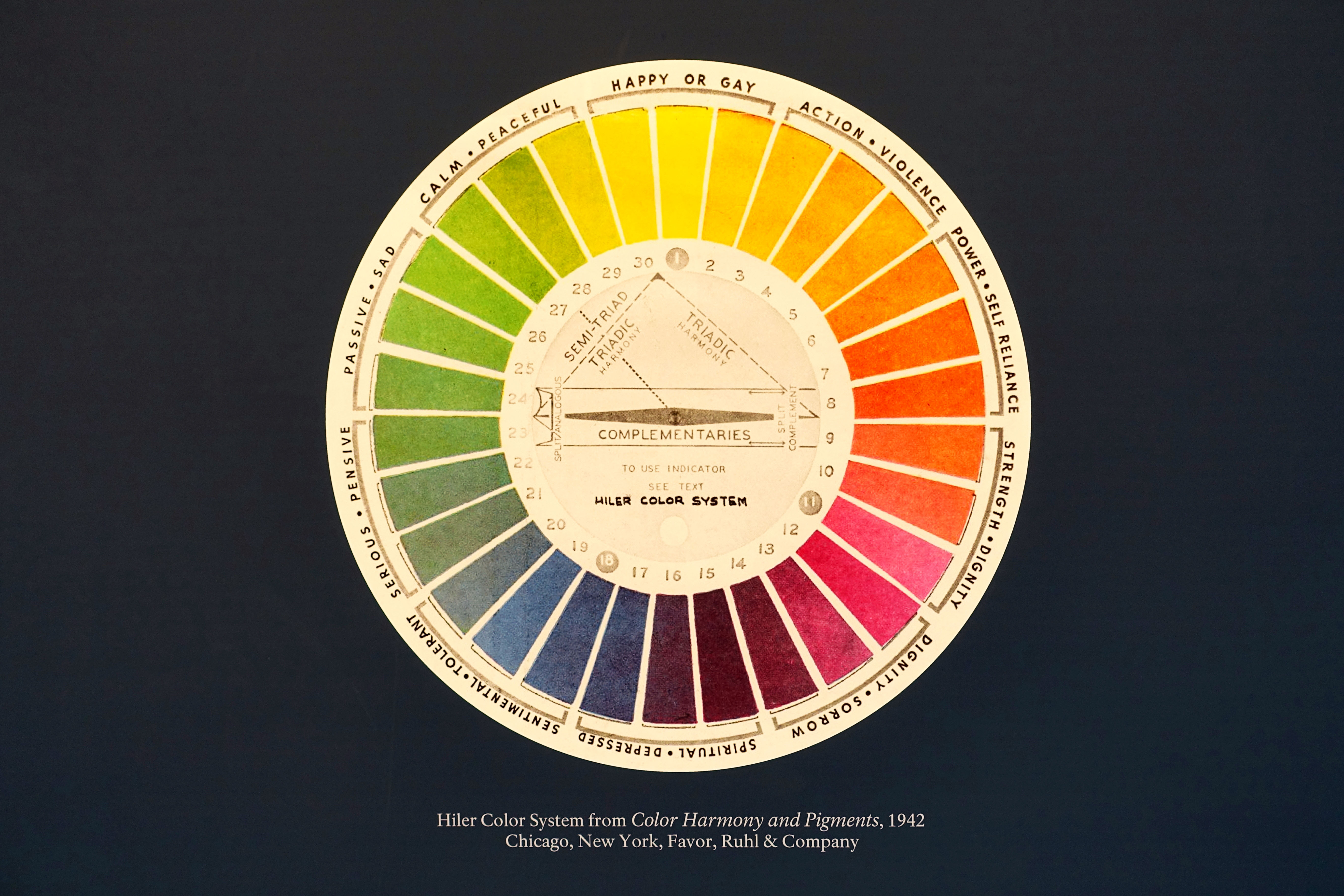 Hiler’s color wheel differs from that of Newton as it is based on ten color groups: yellow, orange, orange-red, red, purple, blue, turquoise, sea green, green, and leaf green. Each group contains three variations, yielding the 30-step wheel.