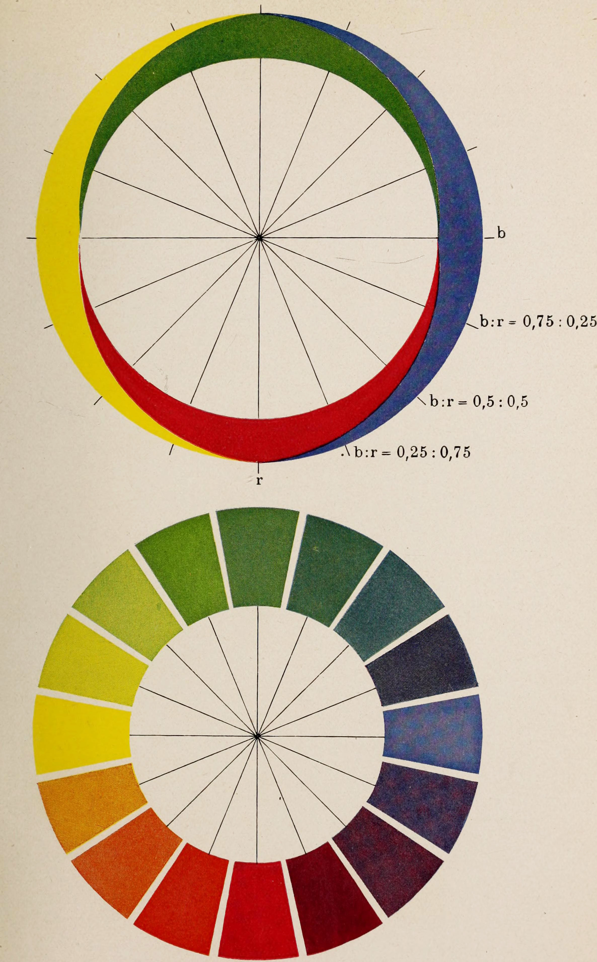The color circle is from the book “The principles of light and color: including among other things the harmonic laws of the universe, the etheric-atomic philosophy of force, chromo chemistry, chromo therapeutics, and the general philosophy of the fine forces, together with numerous discoveries and practical applications ” by Edwin Babbitt (1878).