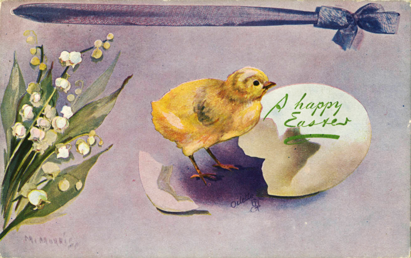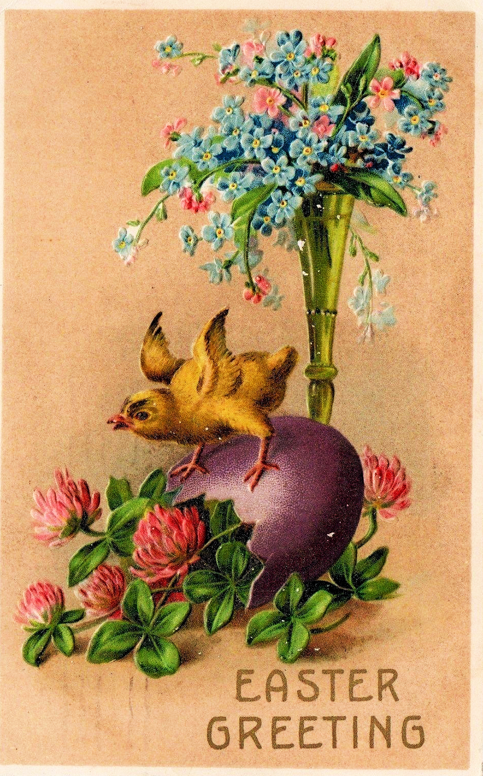 1. Chick, egg, and flowers – Vintage Easter Postcard 1910