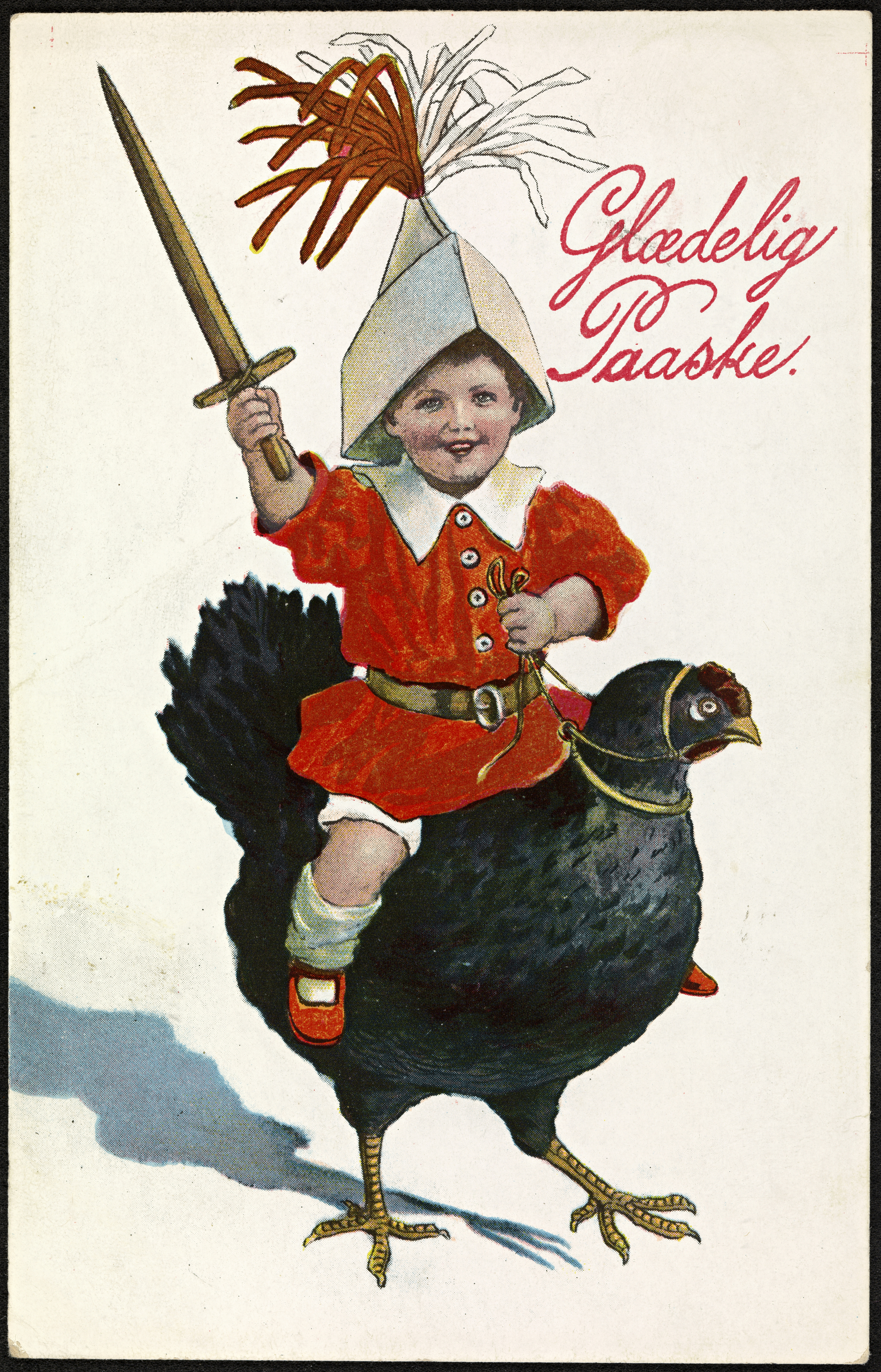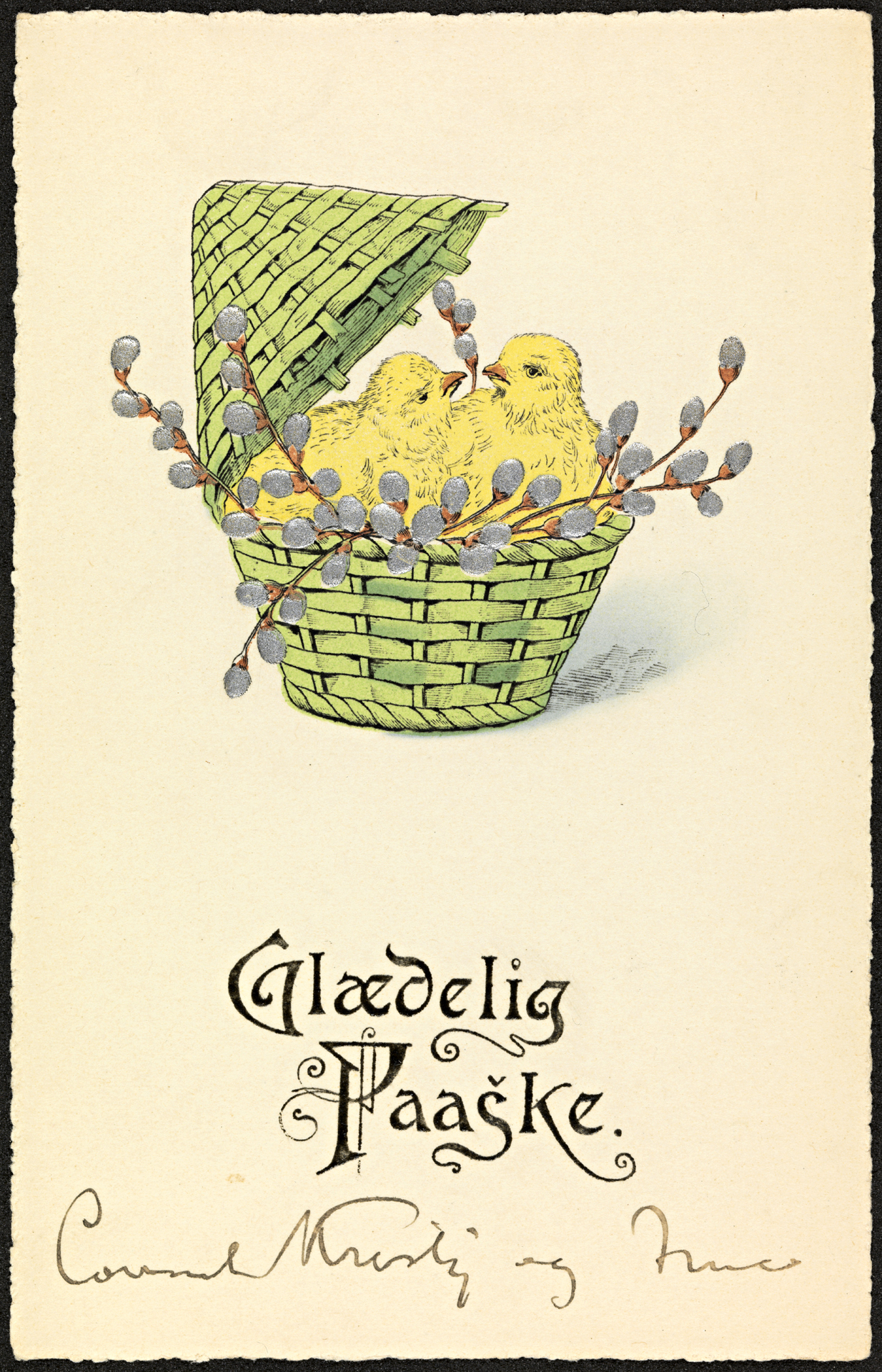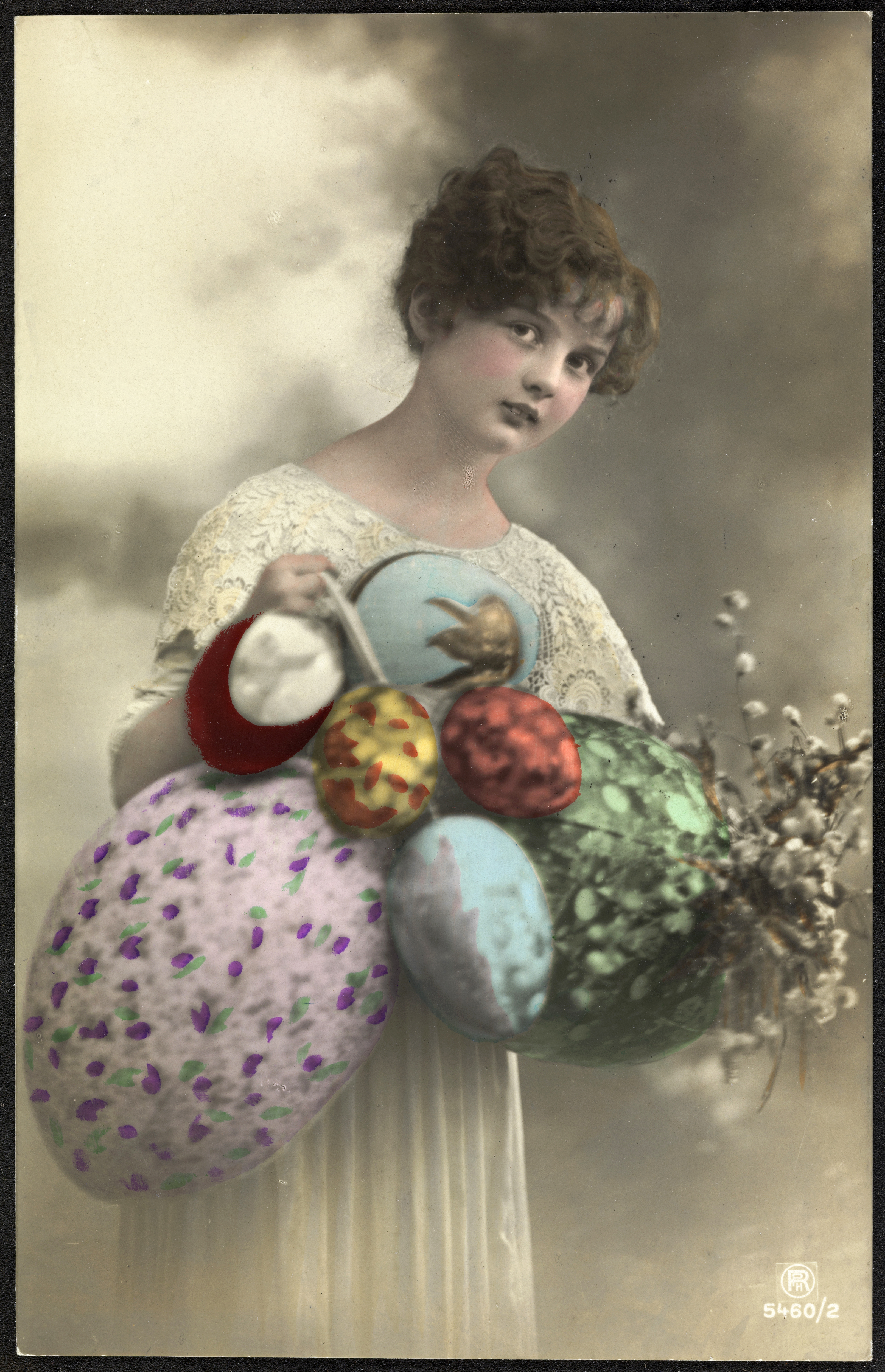 This Easter postcard is slightly different from the others as it’s a colourized black-and-white photo rather than a painting. I love the colourful bouquet of Easter eggs and flowers the girl carries from the National Library of Norway.