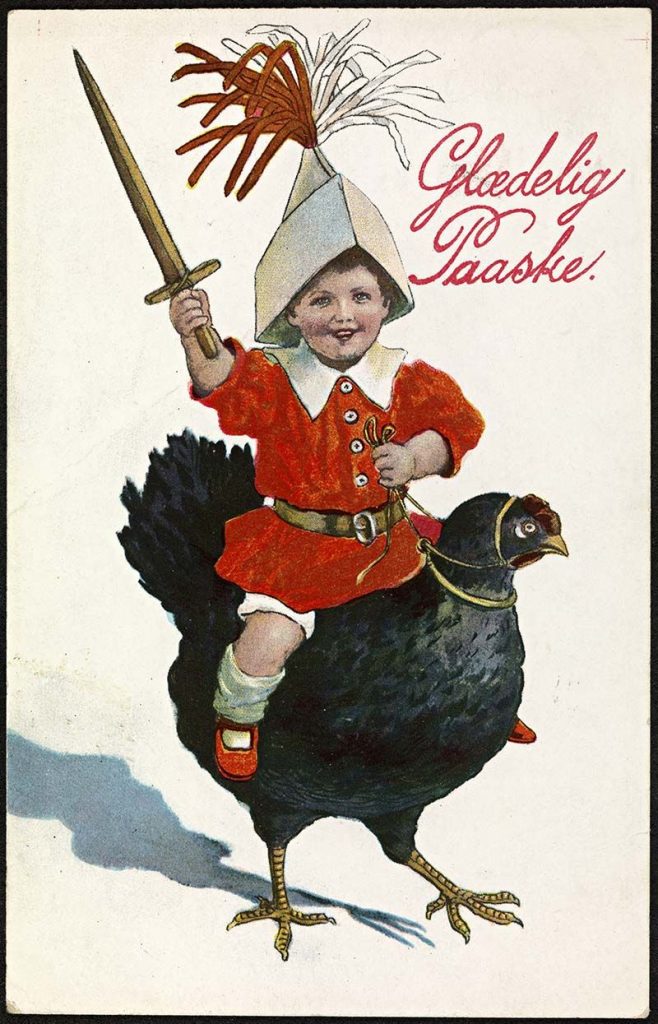 7. Boy Riding Chicken – Norwegian Vintage Postcard