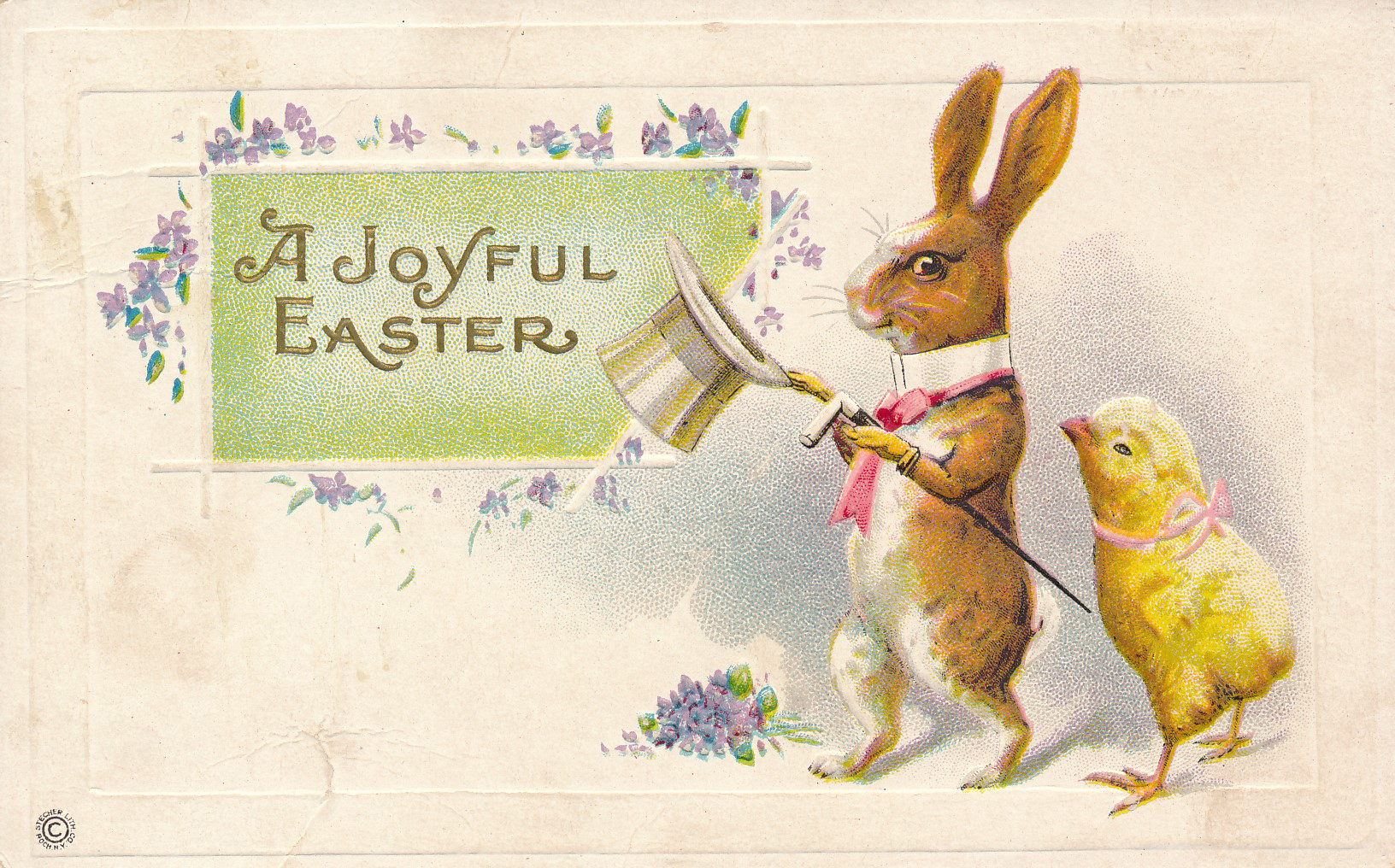Rabbit and chick card 1923. The rabbit reminds me of the Mad Hatter from Alice in Wonderland.