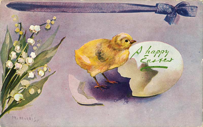 This is another American postcard, one of my earliest examples. It is still very much in the Scandinavian style with the hatching chick. The pink flowers are gorgeous and add to the lovely spring feeling.