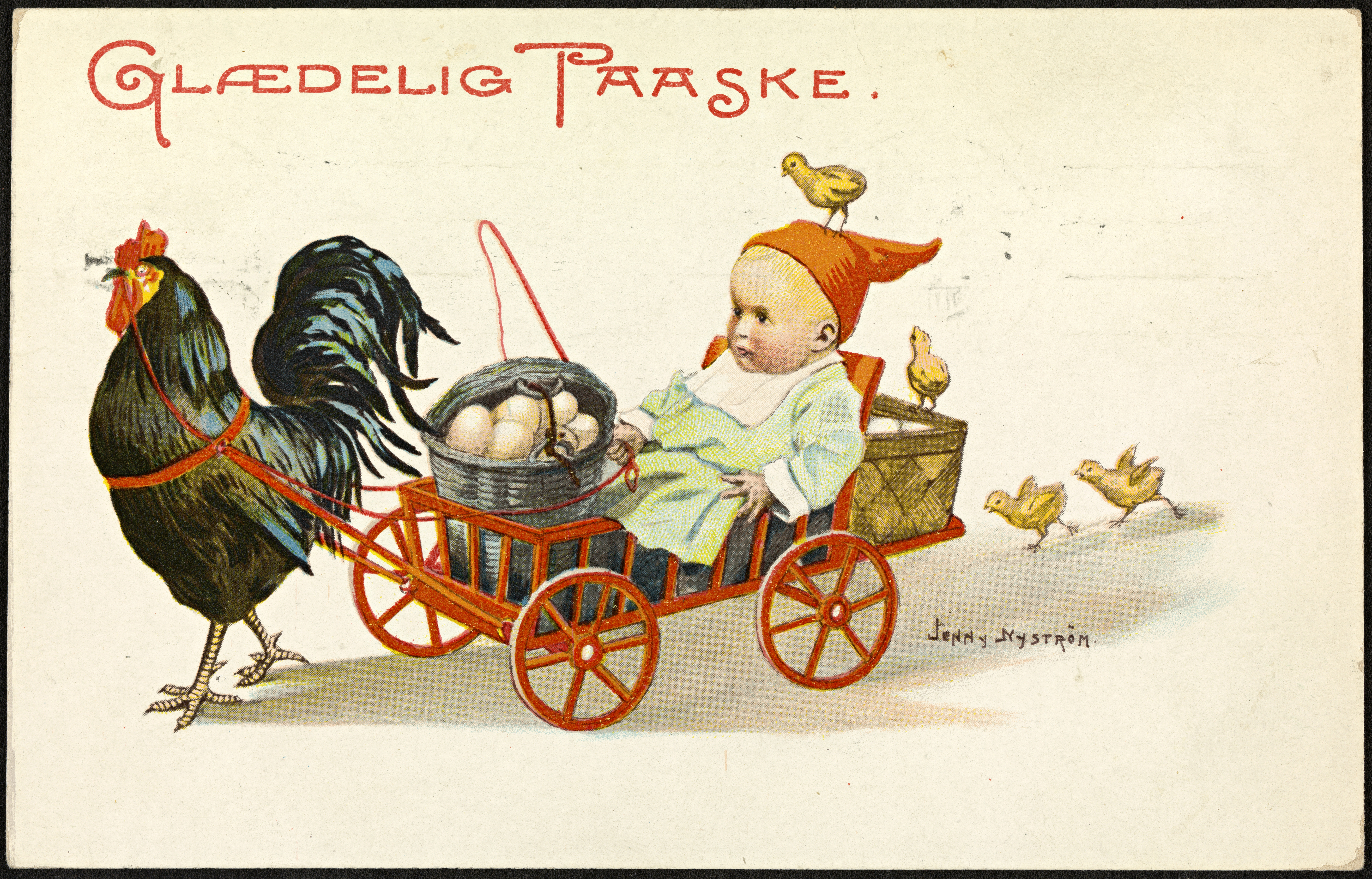 This is a very typical Norwegian scene for a vintage Easter postcard. Chickens and eggs feature a lot in Norwegian Easter postcards. The card was painting in 1910 and from the National Library of Norway.